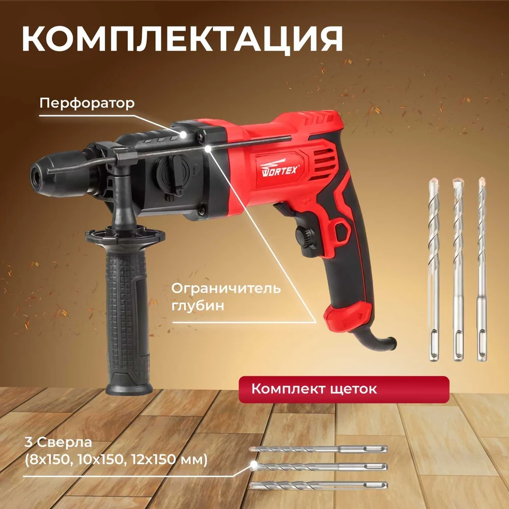 Комплектация Перфоратор; Ограничитель глубины; 3 сверла: 8х150, 10х150, 12х150 мм; Комплект щеток; Паспорт