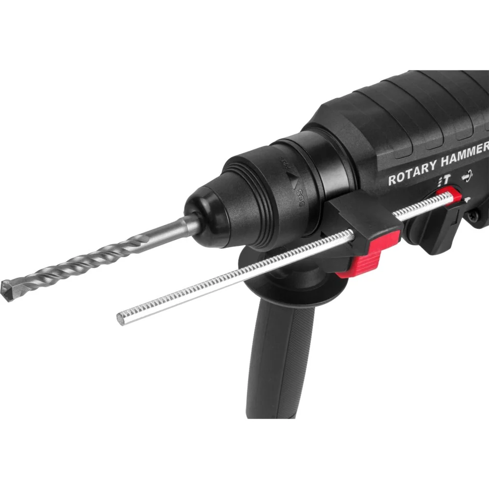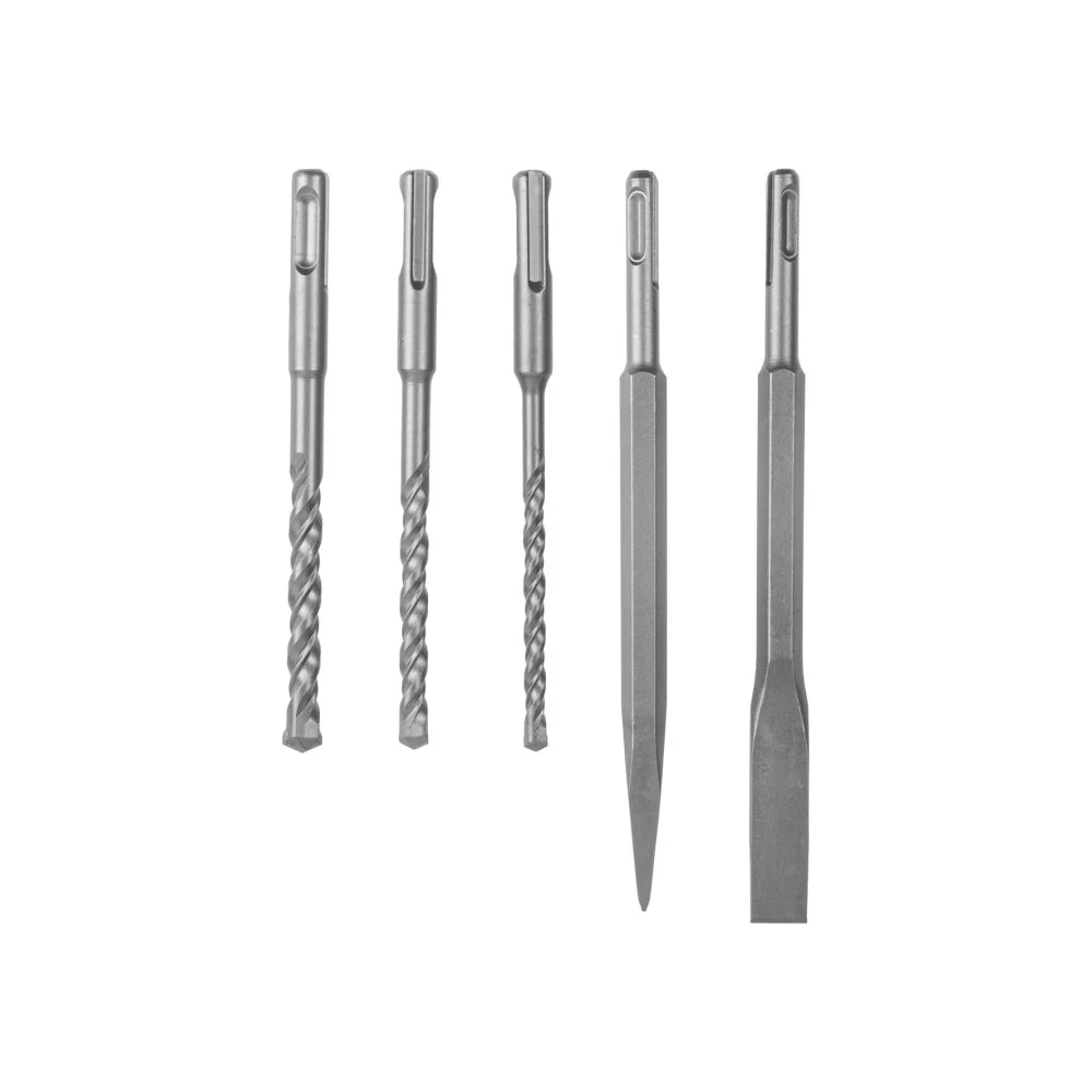 Комплектация Дополнительная рукоятка; 3 сверла: 6х150, 8х150, 10х150 мм; 2 зубила: пиковое 230 мм и плоское 14х230мм; Ограничитель глубины сверления; Кейс