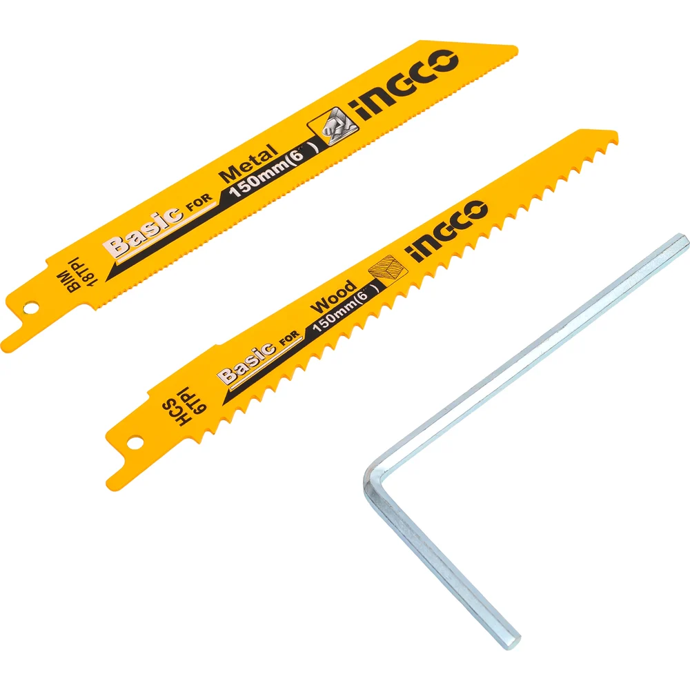 Комплектация Пила сабельная,; Полотно по металлу 150х19мм BIM 18TPI - 1шт.,; Полотно по дереву 150х19мм HCS 6TPI - 1шт.,; ключ шестигранный 4мм - 1шт; угольные щетки 1 пара,; паспорт,; картонная коробка