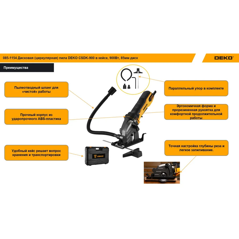 Купить Дисковая (циркулярная) пила DEKO CSDK-900 в кейсе, 900Вт, 85мм диск 085-1154 по лучшей цене с доставкой - интернет магазин №1 в России
