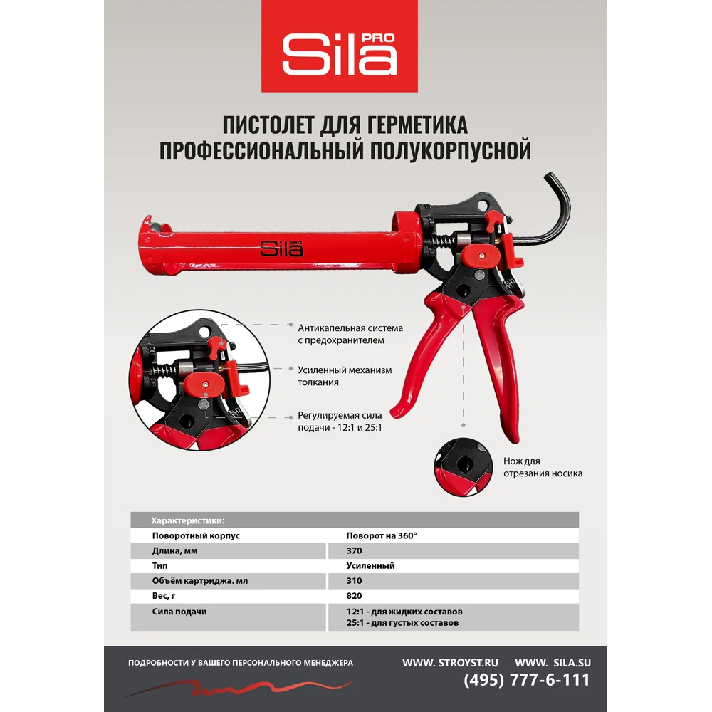 Купить Пистолет для герметика Sila 310 мл, профессиональный, полукорпусный, усиленный, усилие 12:1 и 25:1 2210104 по лучшей цене с доставкой - интернет магазин №1 в России