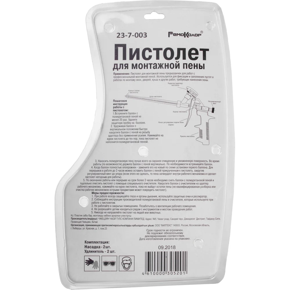 Комплектация Пистолет для монтажной пены; 2 насадки; 2 пластиковых удлинителя; Упаковка