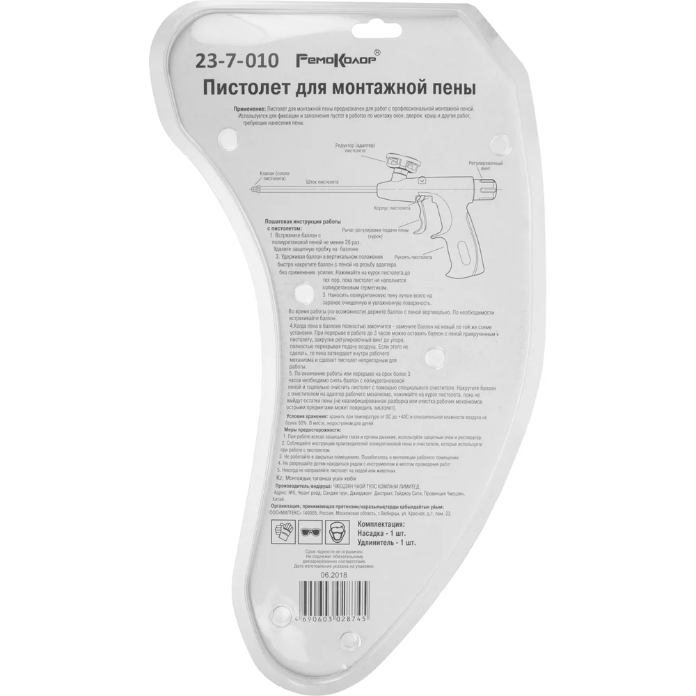 Комплектация Пистолет для монтажной пены; Насадка; Пластиковый удлинитель; Упаковка