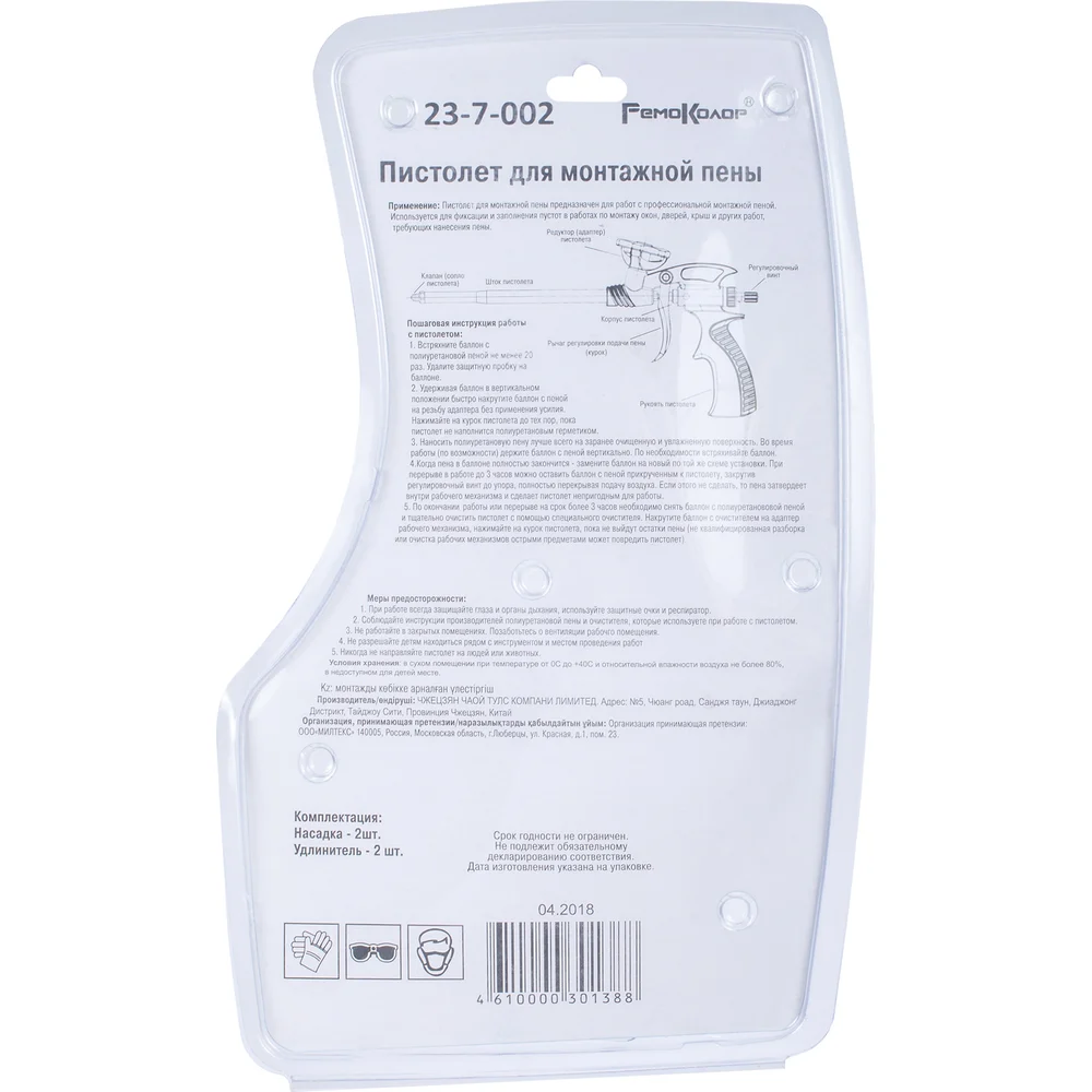 Комплектация Пистолет для монтажной пены; 2 насадки; 2 пластиковых удлинителя; Упаковка