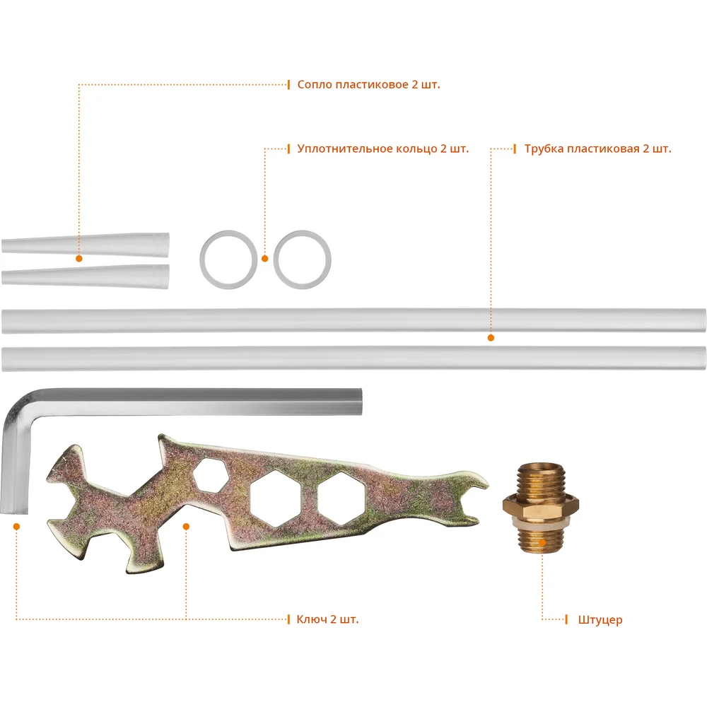 Комплектация Пистолет для монтажной пены; Сопло пласт. 2 шт; Уплот. кольца 2 шт; Штуцер; Коробка