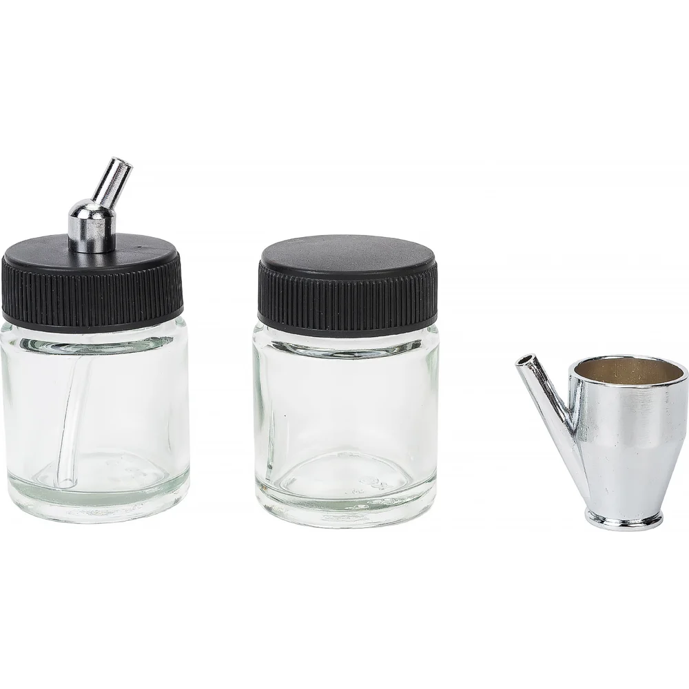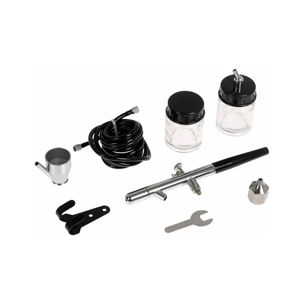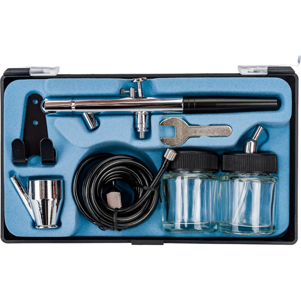 Комплектация Аэрограф; 2 бачка; Ключ; Шланг; Сопло; Кейс