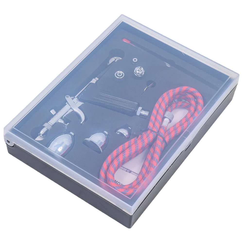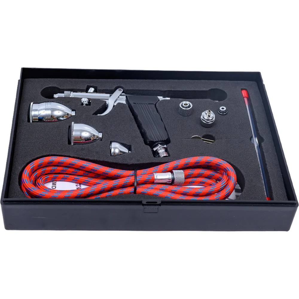 Комплектация Аэрограф с соплом 0,3 мм; Дополнительное сопло 0,5 мм; Дополнительная игла 0,5 мм; Дополнительный диффузор для сопла 0,5 мм; Металлический бачок (без крышки) 2 мл; Металлический бачок (с крышкой) 5 мл; Металлический бачок (с крышкой) 13 мл; Шланг 1,8 м с соединителями с внутренней резьбой 1/8"; Ключ для откручивания сопла; Инструкция на дне коробки под пенопластовым уплотнителем