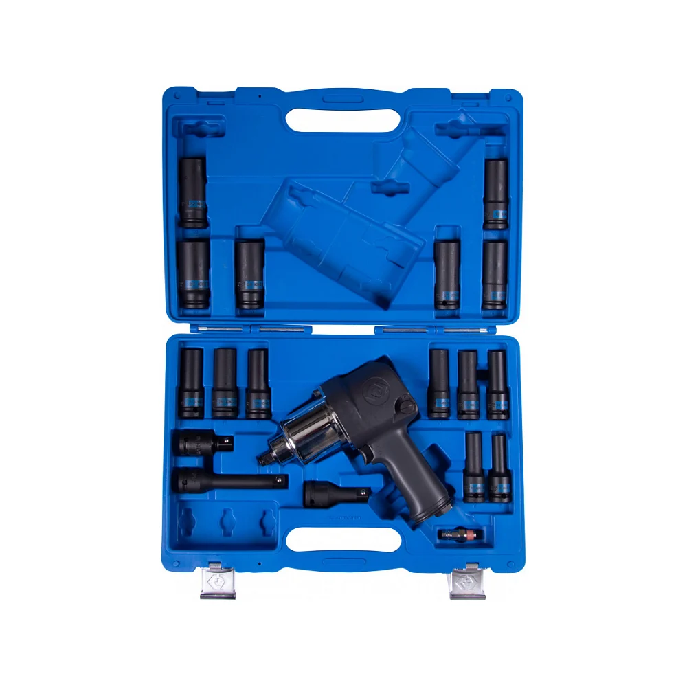 Комплектация Гайковёрт пневматический ударный (арт. 33411-050); Головки ударные глубокие 8, 10, 12, 13, 14, 15, 16, 17, 18, 19, 21, 22, 24, 27 мм (серия 4435M); Удлинитель ударный 125 мм (4260-05P); Удлинитель ударный 75 мм (4260-03P); Кардан ударный шаровый 60 мм (4799P); Штуцер БРС (SY-211M); Инструкция по эксплуатации; Кейс из пластика PE-HD