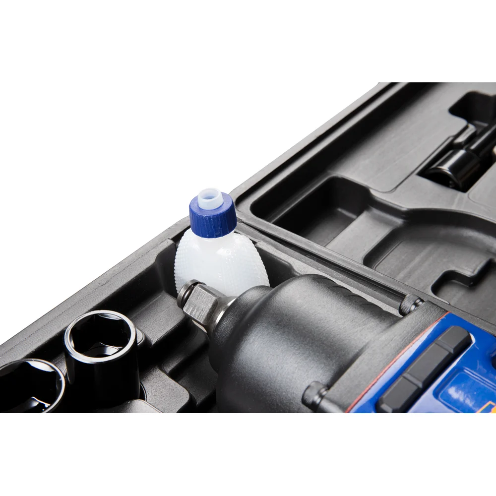Комплектация Гайковерт пневматический ударный KT 707003; Набор торцевых головок (9, 10, 11, 13, 14, 17, 19, 22, 24, 27 мм); Быстросъемный адаптер; Шестигранный ключ; Масло для пневмоинструмента в маслёнке; Удлинитель; Мини-лубрикатор; Кейс