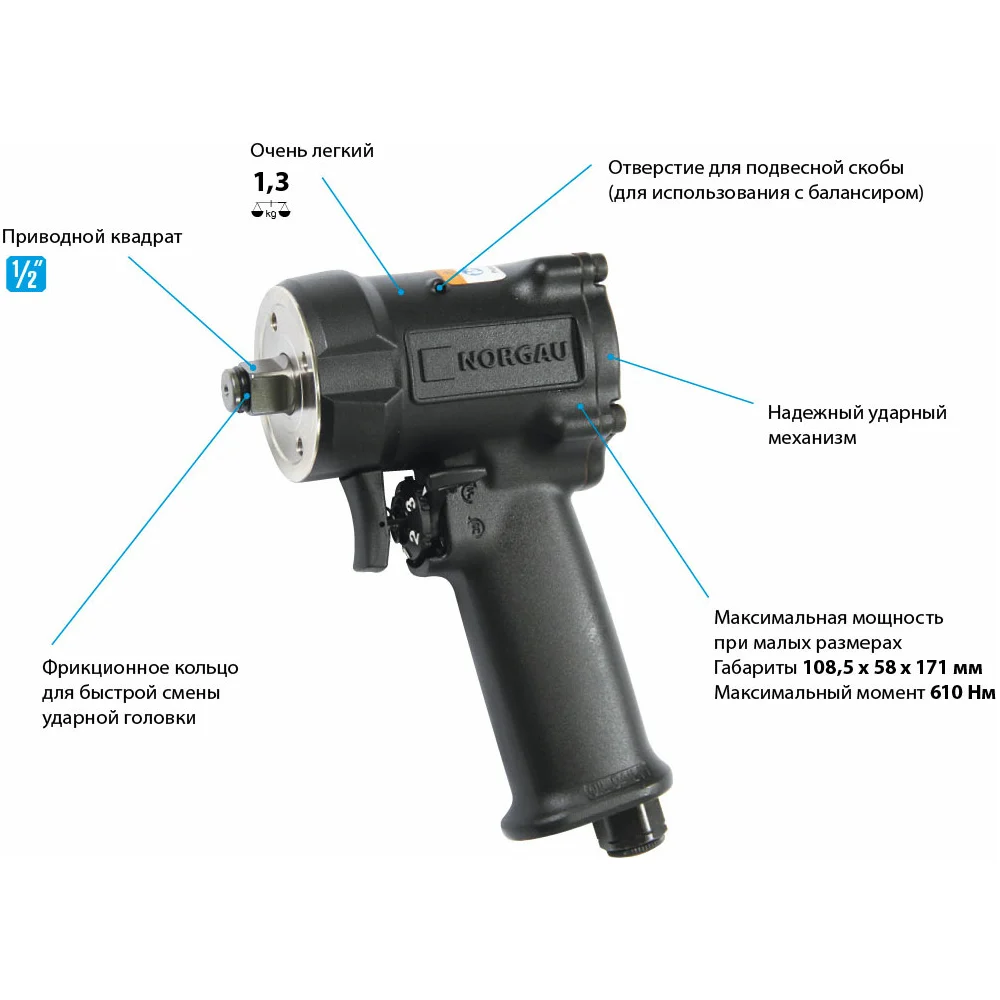 Купить Пневматический ударный гайковерт NORGAU NIW13-068CPS 1/2",610 Нм 094701055 по лучшей цене с доставкой - интернет магазин №1 в России