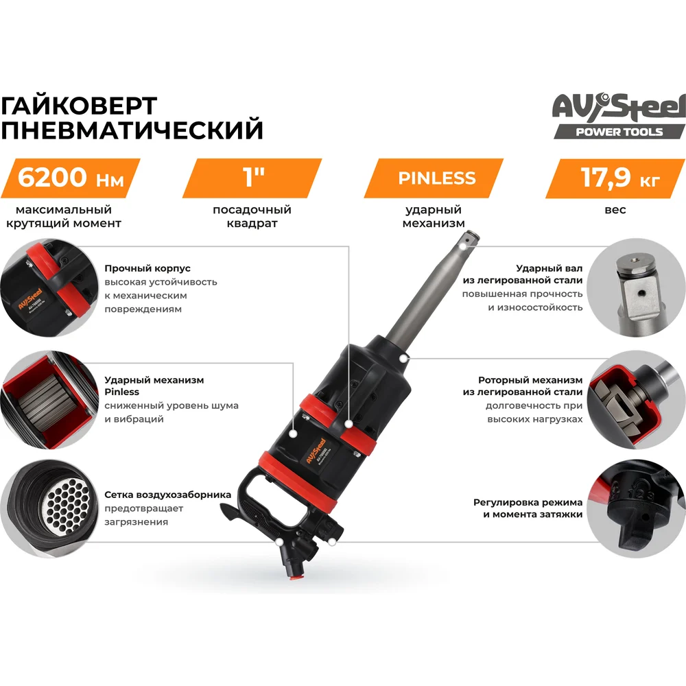 Купить Пневмогайковерт AV Steel 1"dr. 6200Нм 9" 17,9кг AV-766000 по лучшей цене с доставкой - интернет магазин №1 в России