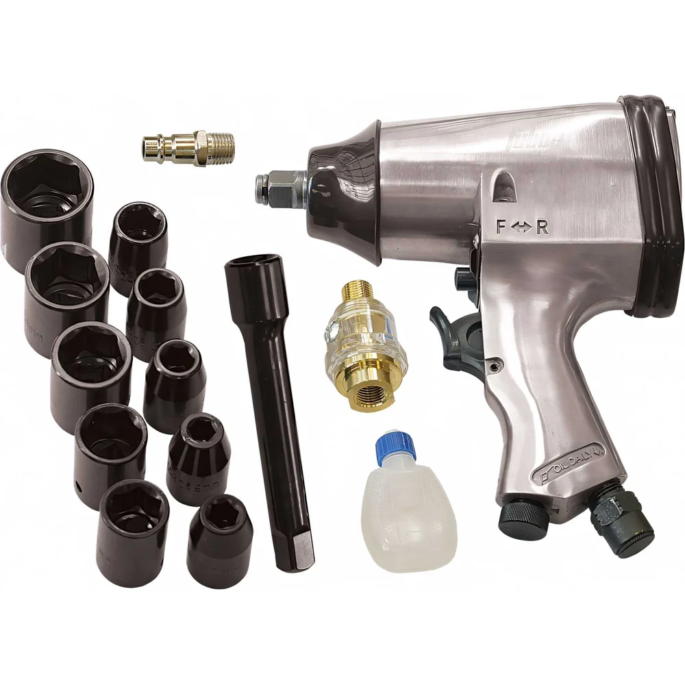 Комплектация 10 головок 1/2"; Удлинитель 1/2" 125 мм; Шестигранный ключ 4 мм; Масленка; Минилубрикатор; Штуцер; Кейс
