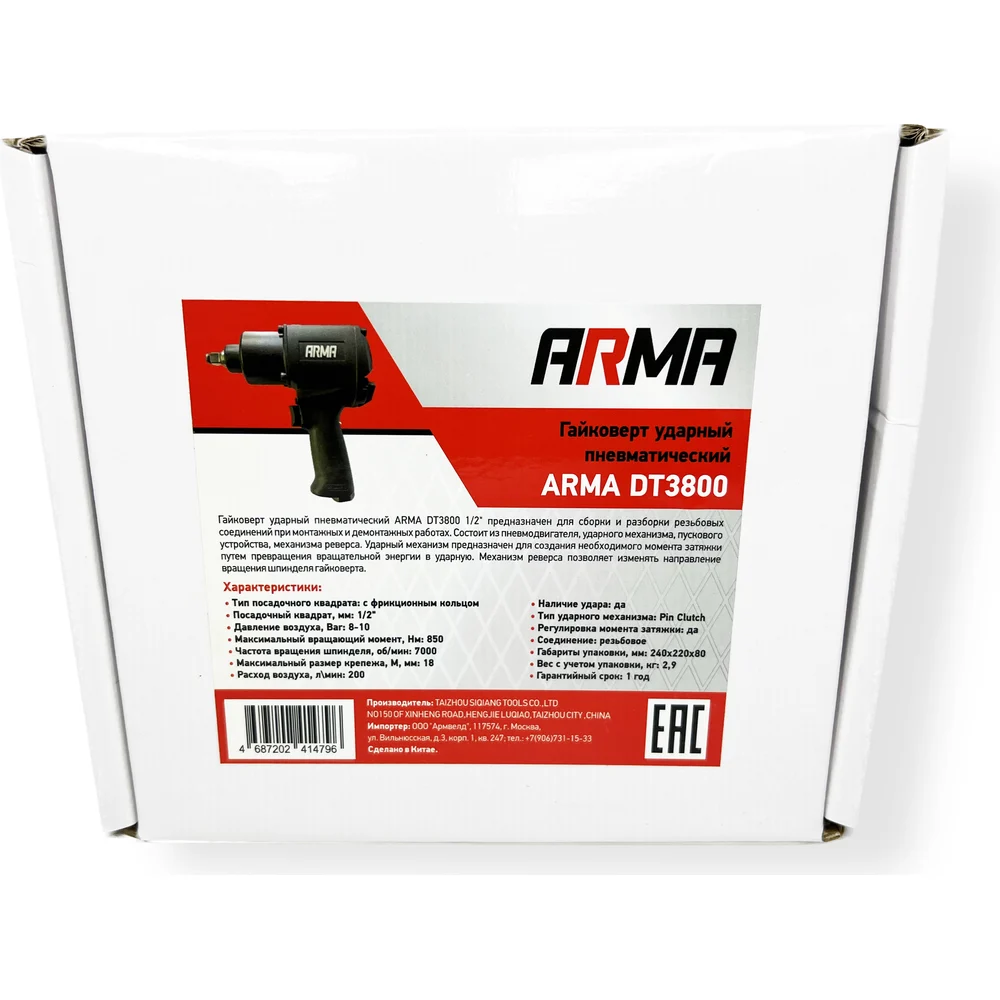 Комплектация Гайковерт ударный пневматический ARMA DT3800; Коробка