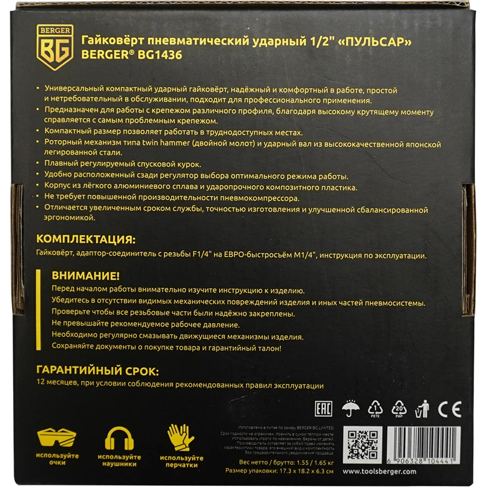 Купить Ударный пневматический гайковерт Berger BG ПУЛЬСАР 1/2", 680 Нм BG1436 по лучшей цене с доставкой - интернет магазин №1 в России