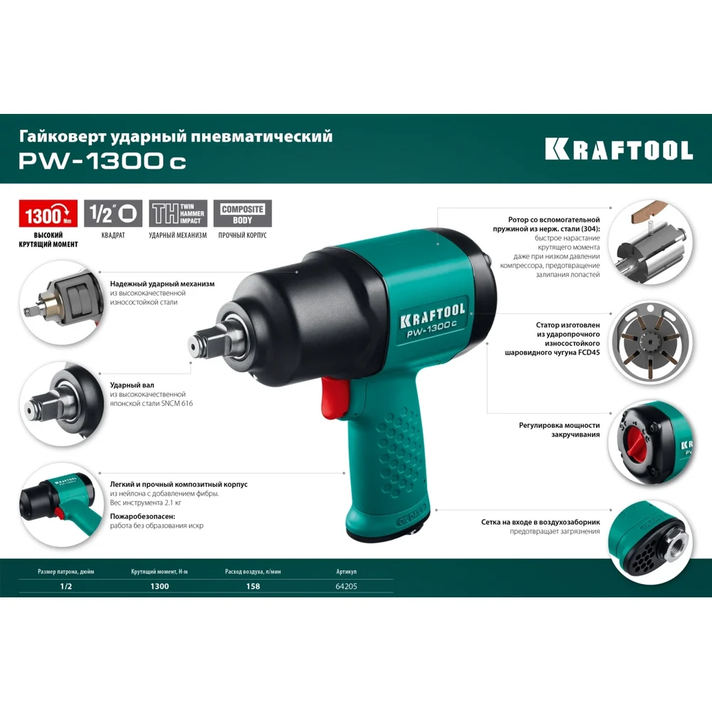 Купить Ударный пневматический гайковерт KRAFTOOL PW-1300c, 1/2" 1300 Нм 64205 по лучшей цене с доставкой - интернет магазин №1 в России
