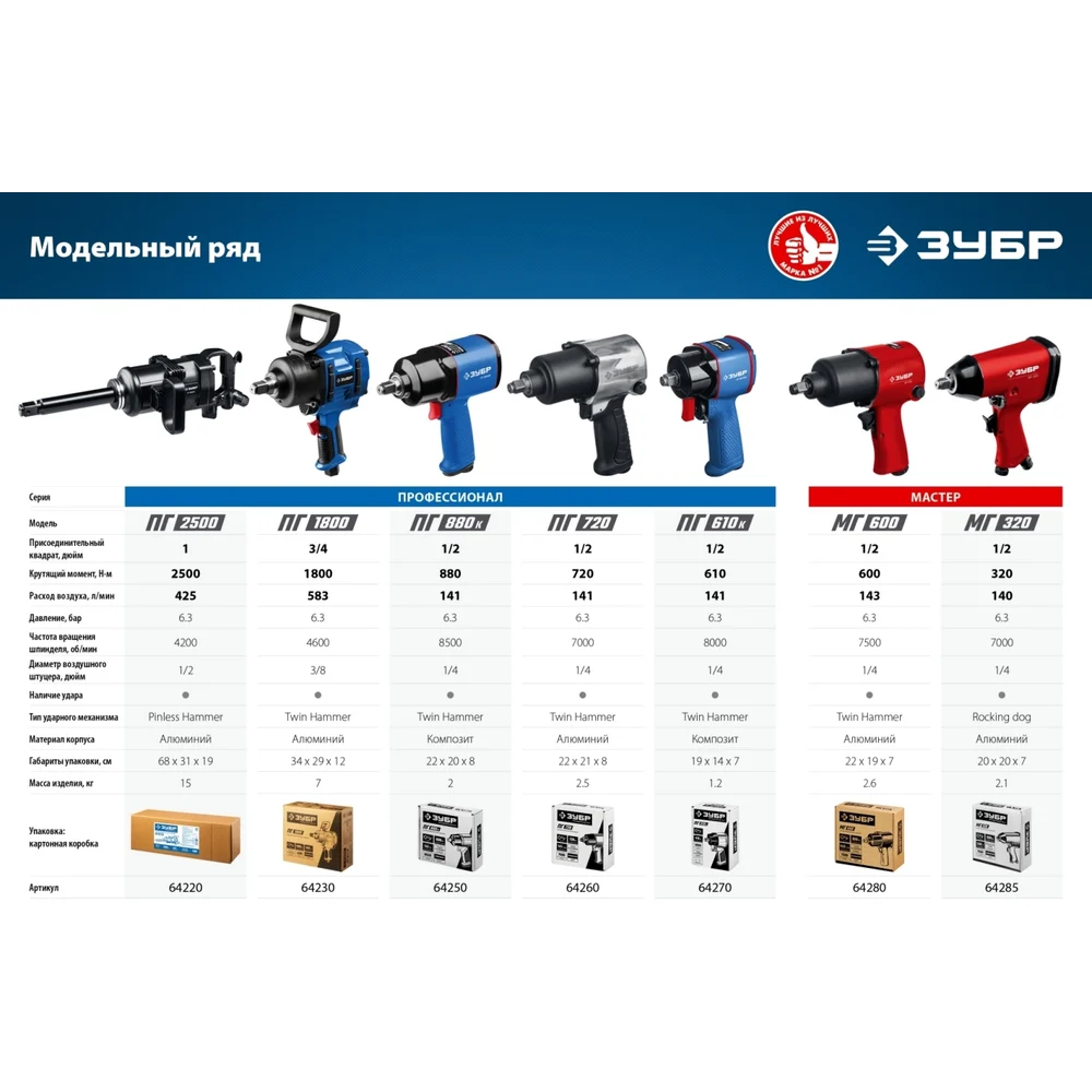 Ударный пневматический гайковерт ЗУБР МГ-320 1/2", 320 Нм 64285