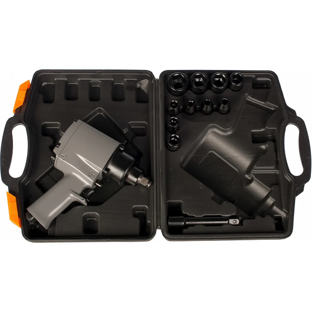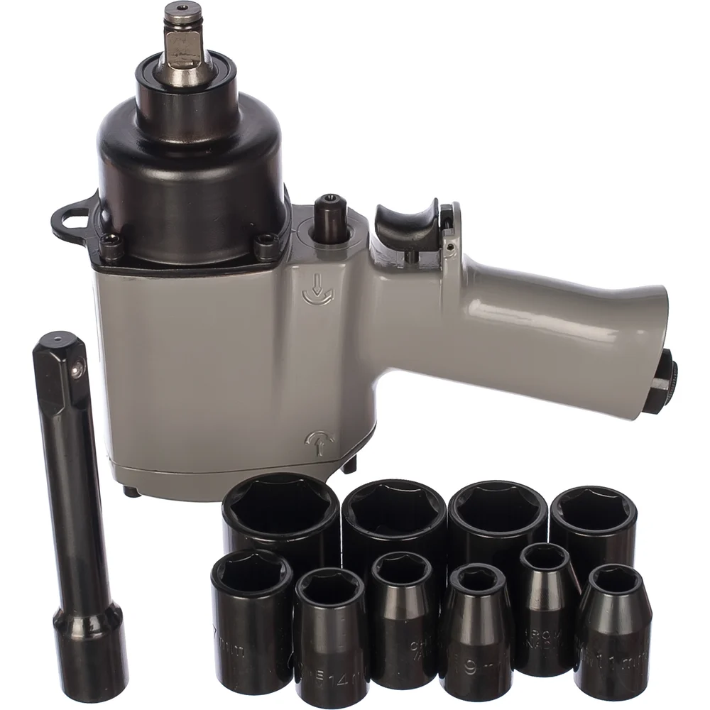 Комплектация Пневмогайковерт; 10 головок: 9, 10, 11, 13, 14, 17, 19, 22, 24, 27 мм; Удлинитель; Рапид-штуцер; Кейс