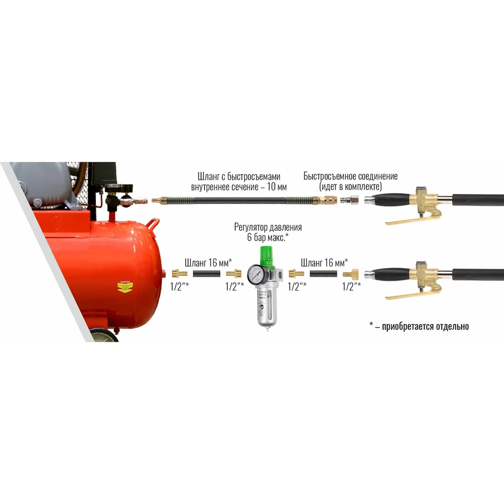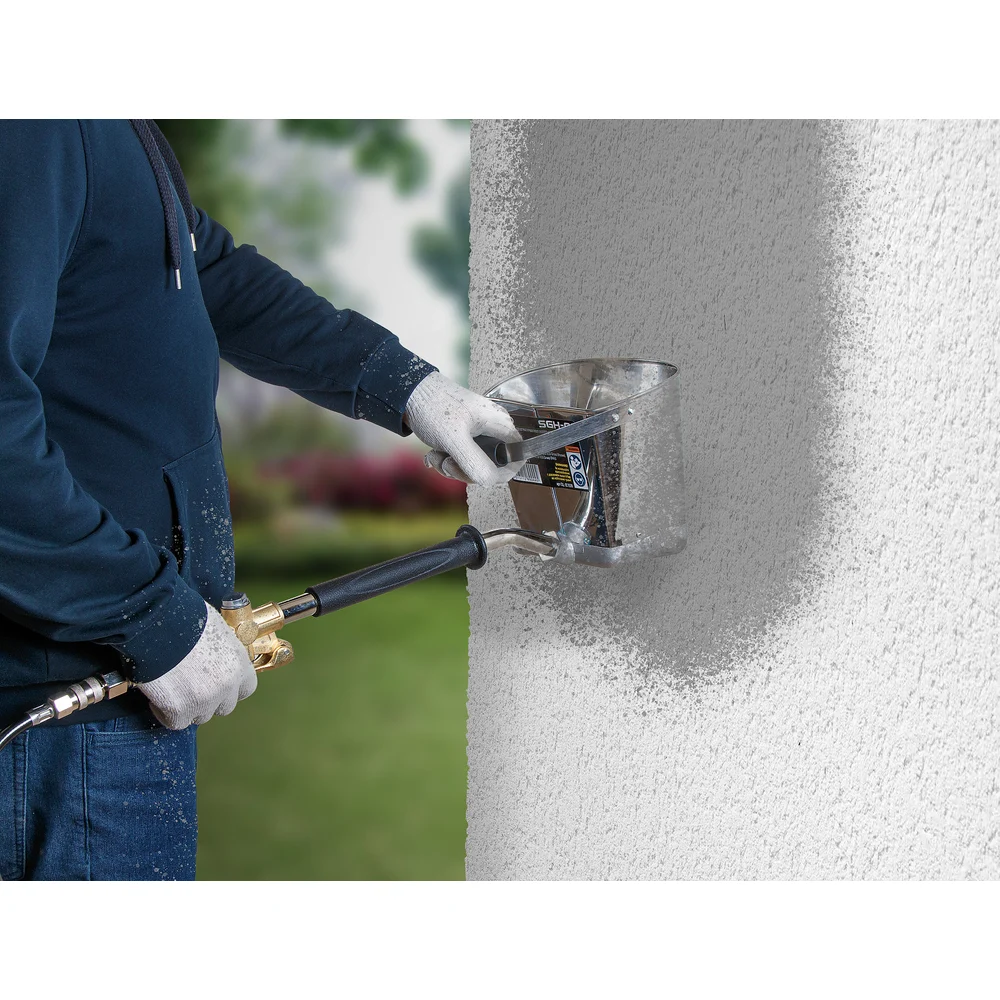 Комплектация Ковш для материала с 4 соплами; Контргайка для фиксации ковша; Воздушная трубка-ручка; Вспомогательная рукоятка (крепится на ковш); Курок подачи воздуха с рукояткой; Быстросъемный штуцер; Комплект крепежа для вспомогательной рукоятки