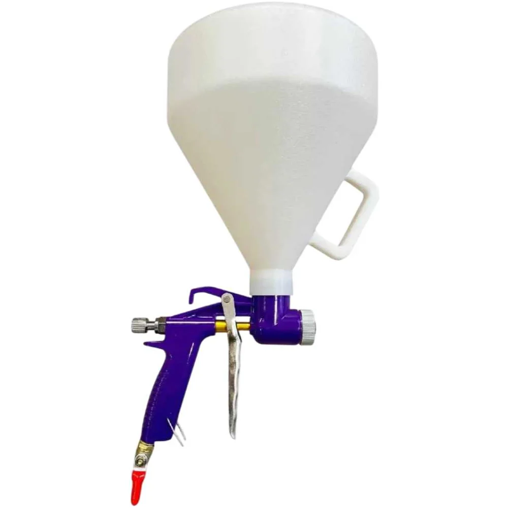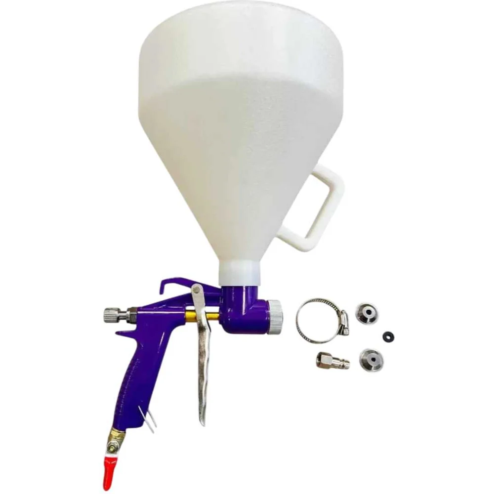 Комплектация Хоппер (текстурный пистолет) с бачком 5 л; Хомут для фиксации бачка к пистолету; Сменные сопла 4,5; 6,0; 8,0 мм; Штуцер БРС F1/4" - 2 шт; Шаровый кран для перекрытия сжатого воздуха