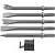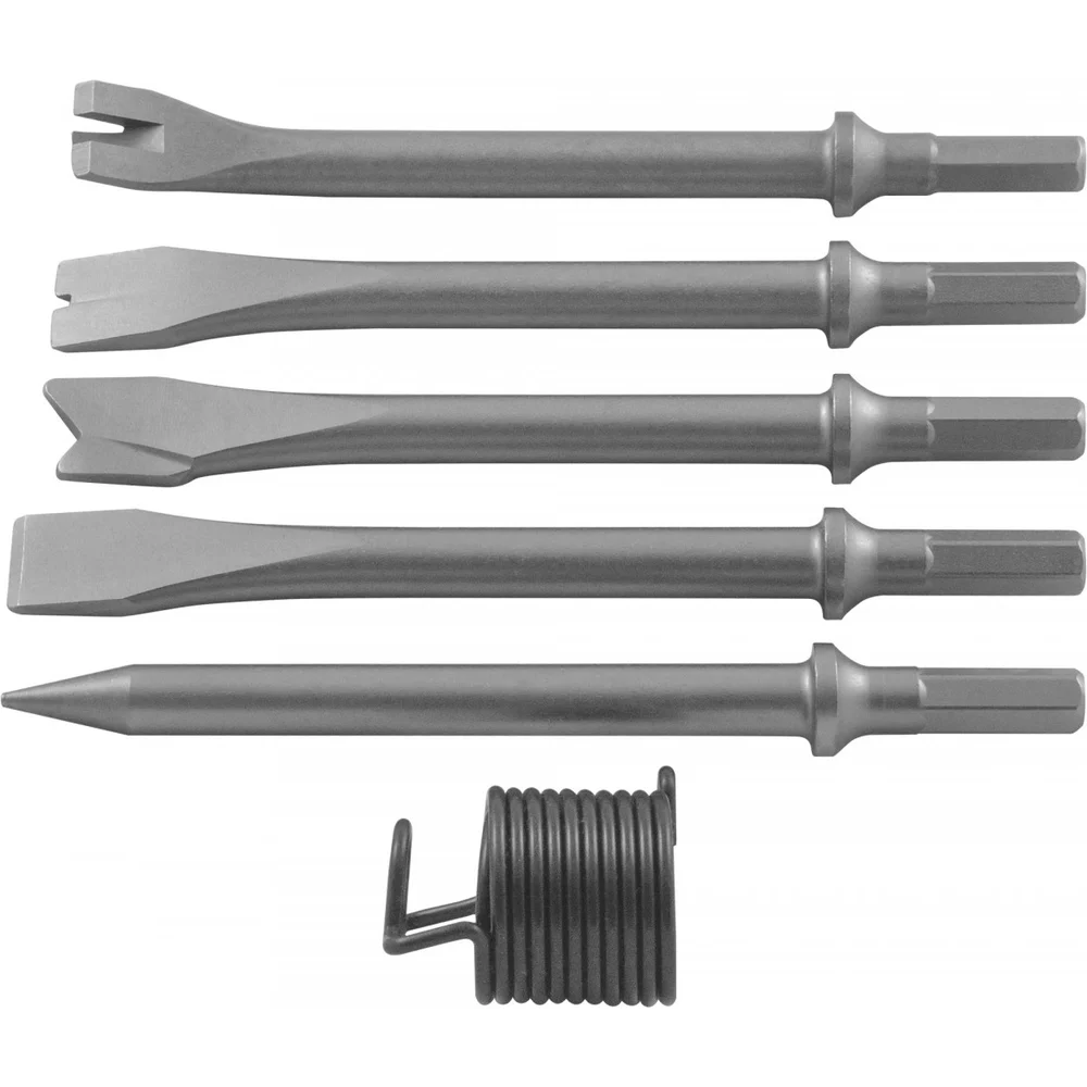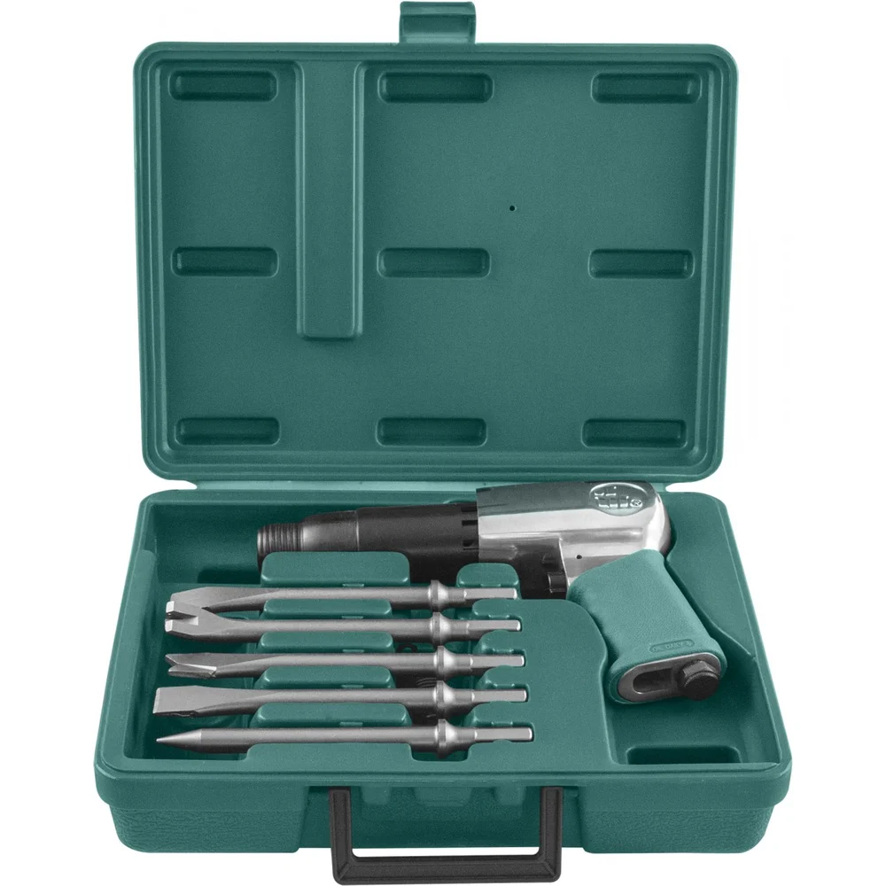 Комплектация Пневматический молоток; Набор хромо-молибденовых зубил (резак, резак для сварочных швов, конический пробойник, плоское долото, односторонний резак); Пластиковый кейс