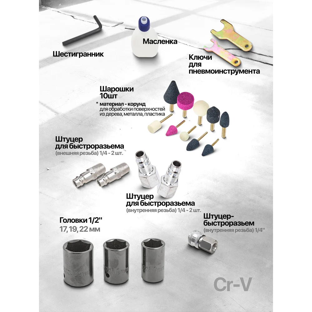 Комплектация Гайковерт 1/2 320Нм; Пневмотрещотка 1/2 68 Нм; Пистолет обдувочный; Пистолет подкачка; Пневмобормашинка с цанговым зажимом 25000 об/мин; Ключ для пневмоинструмента - 3 шт; Штуцер для быстроразъема внутр. резьба 1/4-2шт; Штуцер для быстроразъема наруж. резьба 1/4-2шт; Доп дюза к пневмобормашинки 3 мм; Масленка; Шарошки -5шт; Быстроразъем внутр резьба 1/4; Шланг витой с быстроразъемами 5м; Головки 1/2 : 17,19,22-3 шт; Кейс