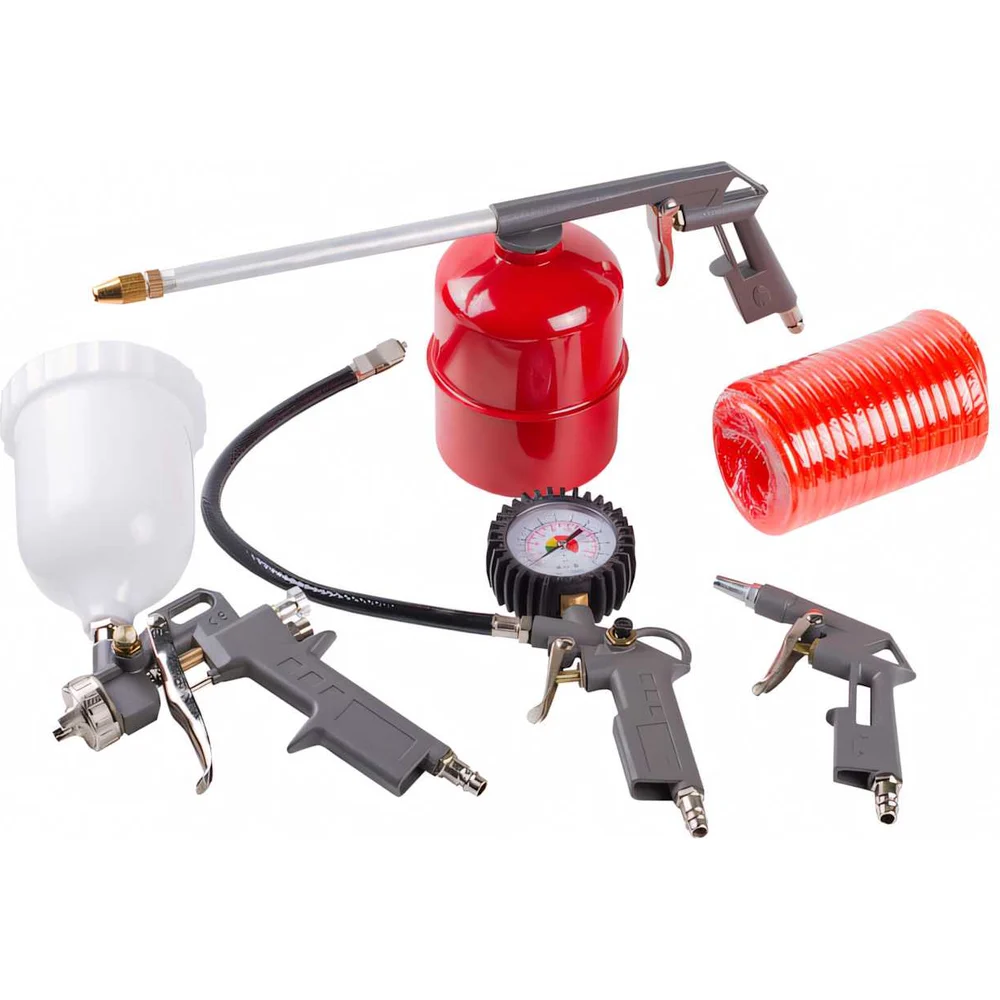 В наборе краскораспылитель, пистолет моечный, пистолет для подкачки шин, пистолет продувочный, шланг спиральный