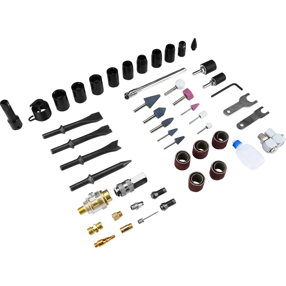 Комплектация пневматическая шлифовальная машина; пневматическая трещотка; пневматический гайковерт; пневматический молот 150 мм; продувочный пистолет; пистолет воздушный; ударные головки: 12,13,17,19 мм, 1/2 ’’, 9/16 ’’, 5/8 ’’, 11/16 ’’; удлинитель; переходник с 3/8 ’’ на 1/2 ’’; зубила, 4шт 120мм; фиксатор пружины; ручные ключи, 2шт; шестигранный ключ, 1шт 4мм; цанга, 2шт 1/8 ’(3 мм), 1/4’ (6 мм); шлифовальный камень, 5шт 1/8 ’’ (3мм); шлифовальный камень, 5шт 1/4 ’’ (6мм); 1/4-дюймовый шлифовальный барабан; 1 ’’ шлифовальный барабан; насадка для шлифовального барабана, 5 шт 3/4 ’’; гильза для шлифовального барабана, 5шт 1 ’’; соединитель; шарнирное соединение 360 градусов; лента; шинный манометр; ответвитель (папа); резиновая насадка; предохранительный патрубок; высоконапорное сопло; сопло с обратной конусностью; точечная игла и адаптер; масленка; масло; кейс; паспорт изделия