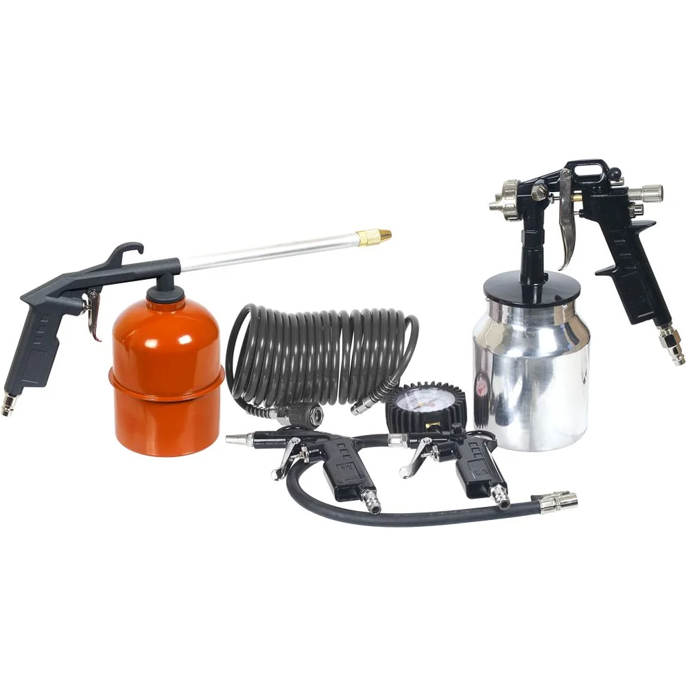 В наборе краскопульт с нижним бачком, продувочный пистолет, пистолет для накачки шин, мовильный пистолет, спиральный полиуретановый шланг