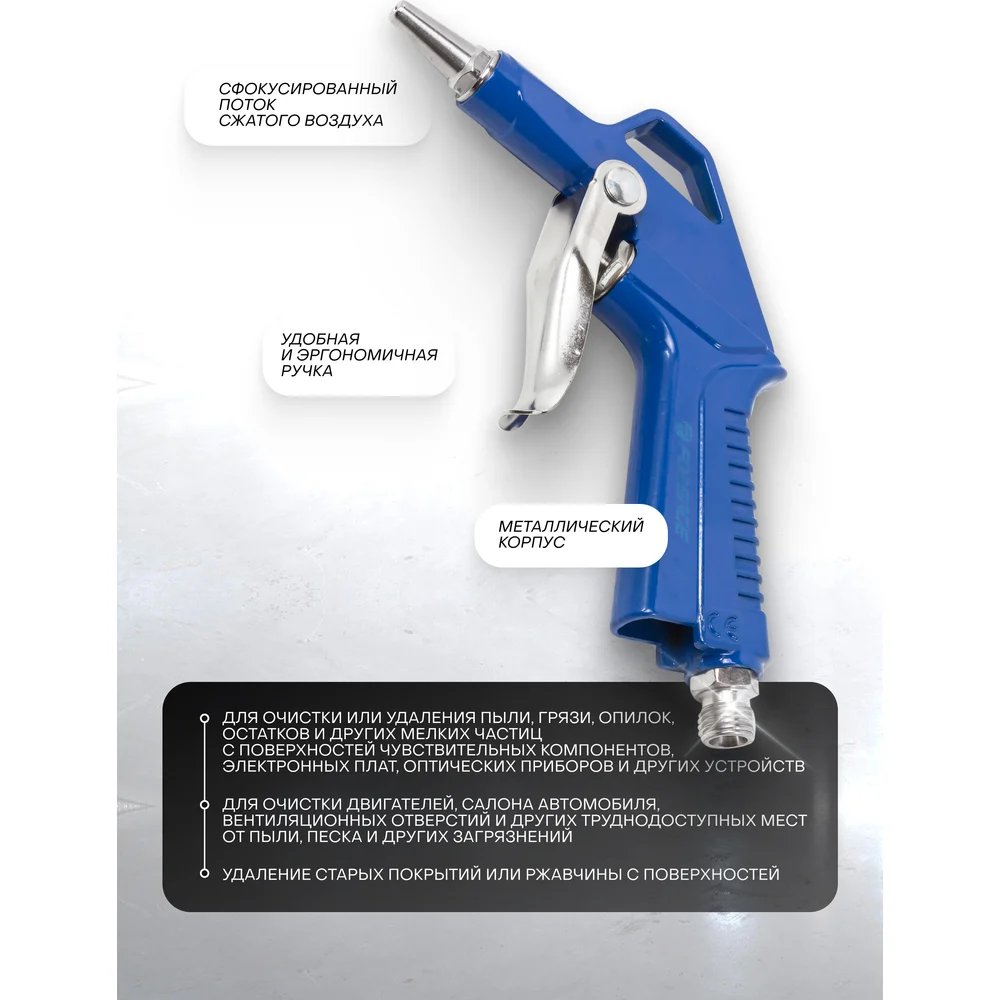 Комплектация Пистолет обдувочный; Сопло 20, 90, 165 мм; Штуцер елочка 8 мм; Штуцер под быстросъем 1/4"