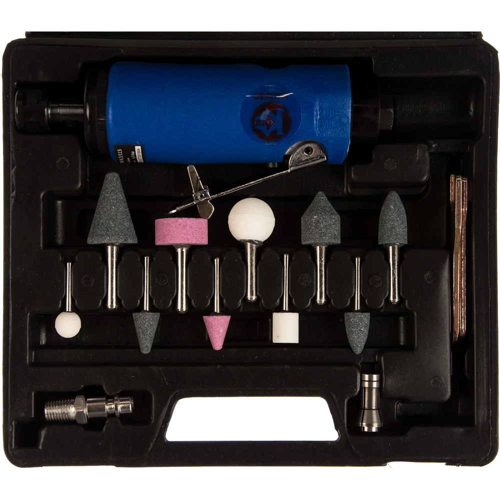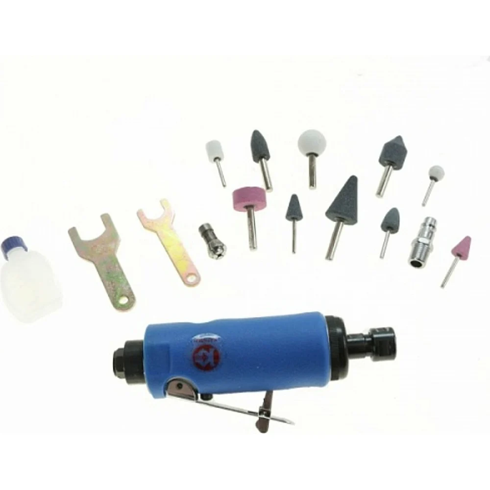Комплектация Гравёр с цангой 6мм; Переходник выходного штуцера «рапид»; Ключ рожковый 2шт; Цанга 3мм; Набор насадок: - хвостовик 3мм 5шт. - хвостовик 6мм 5шт; Ёмкость со смазкой; Руководство по эксплуатации; Кейс пластиковый