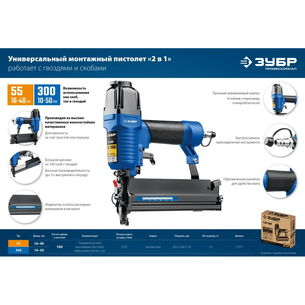 Купить Пневматический нейлер-степлер 2-в-1 для скоб и гвоздей ЗУБР Т55/300 31937 по лучшей цене с доставкой - интернет магазин №1 в России