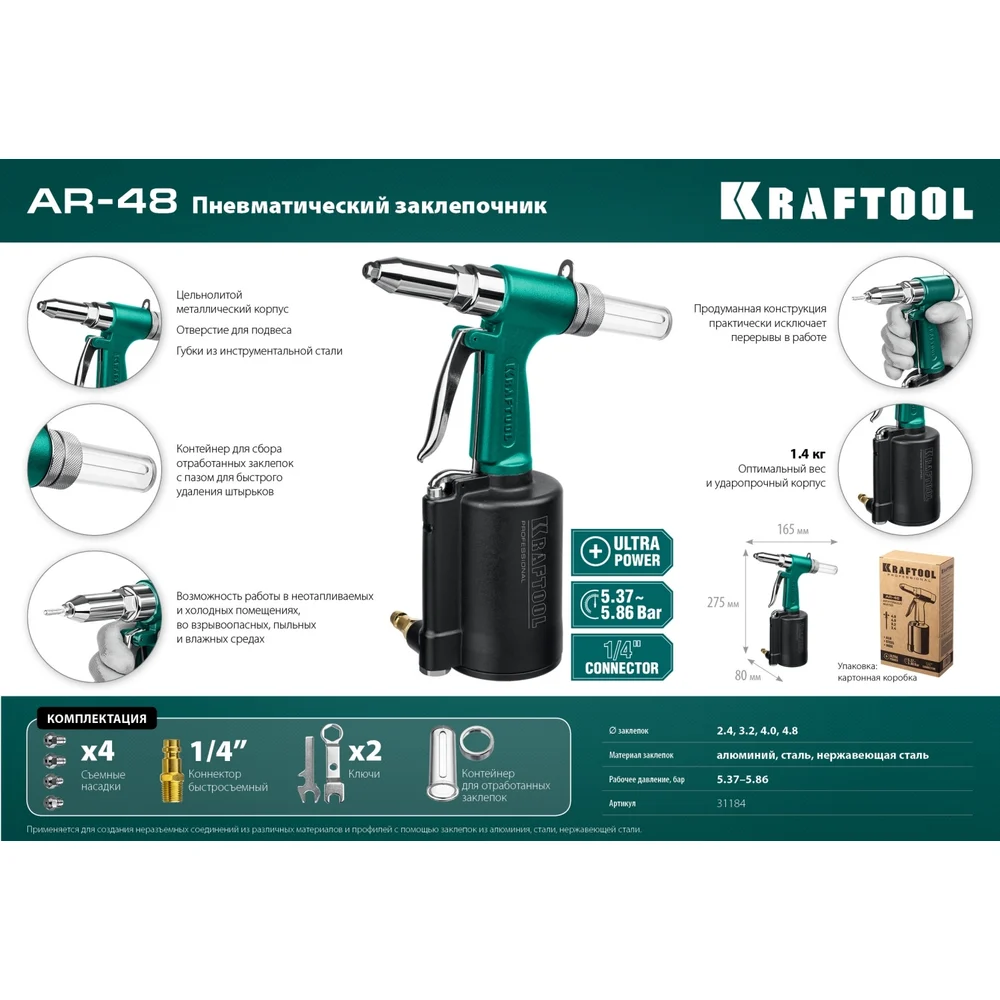 Купить Пневматический заклепочник KRAFTOOL AR-48 2.4-4.8 мм 31184 по лучшей цене с доставкой - интернет магазин №1 в России