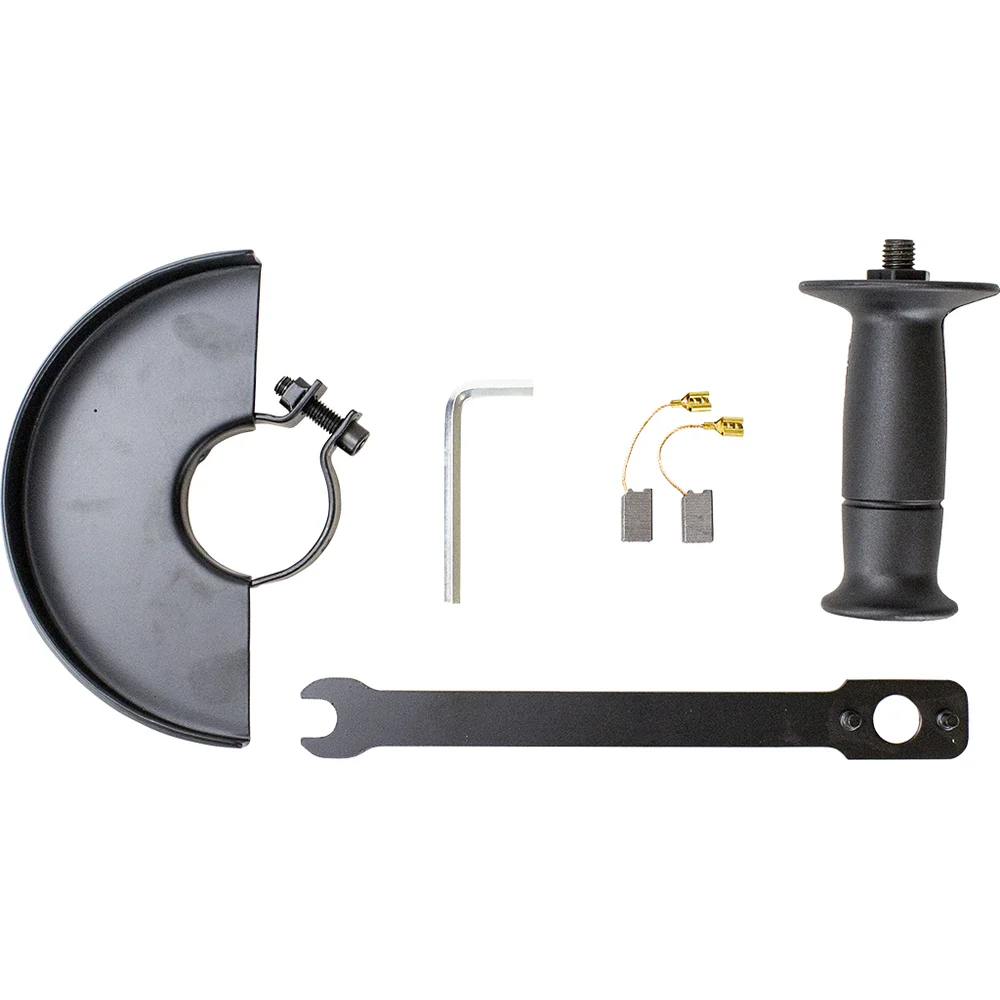 Комплектация МШУ 1шт; Дополнительная рукоятка 1шт; Защитный кожух 1шт; Ключ для замены диска 1шт; Руководство по эксплуатации 1шт; Угольные щётки 2шт