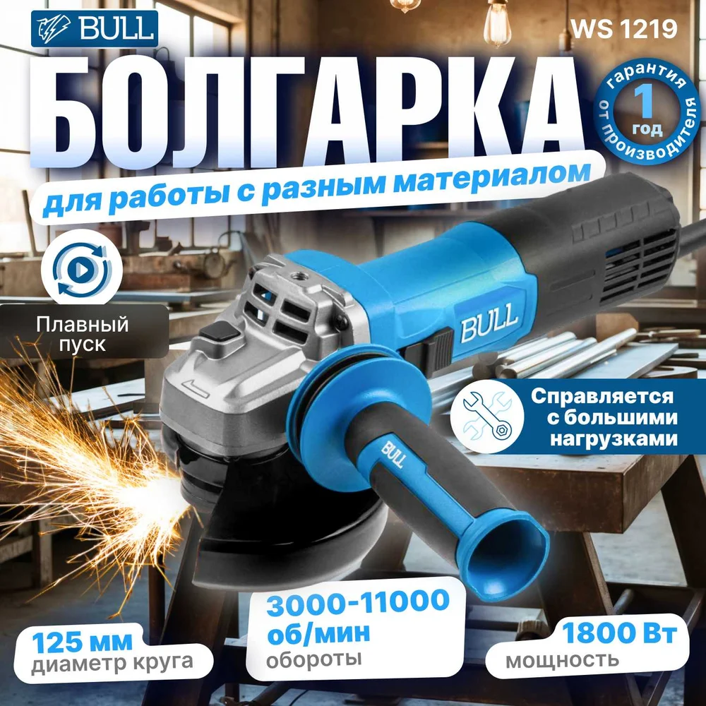 Купить Одноручная углошлифмашина BULL WS 1219 в коробке. 125 мм, 1800 Вт, плавный пуск, регулировка оборотов 1333516 по лучшей цене с доставкой - интернет магазин №1 в России