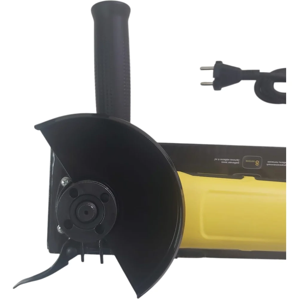 Комплектация Углошлифовальная машина; Боковая ручка; Защитный кожух; Гаечный ключ; Шестигранный ключ; Комплект угольных щеток; Коробка