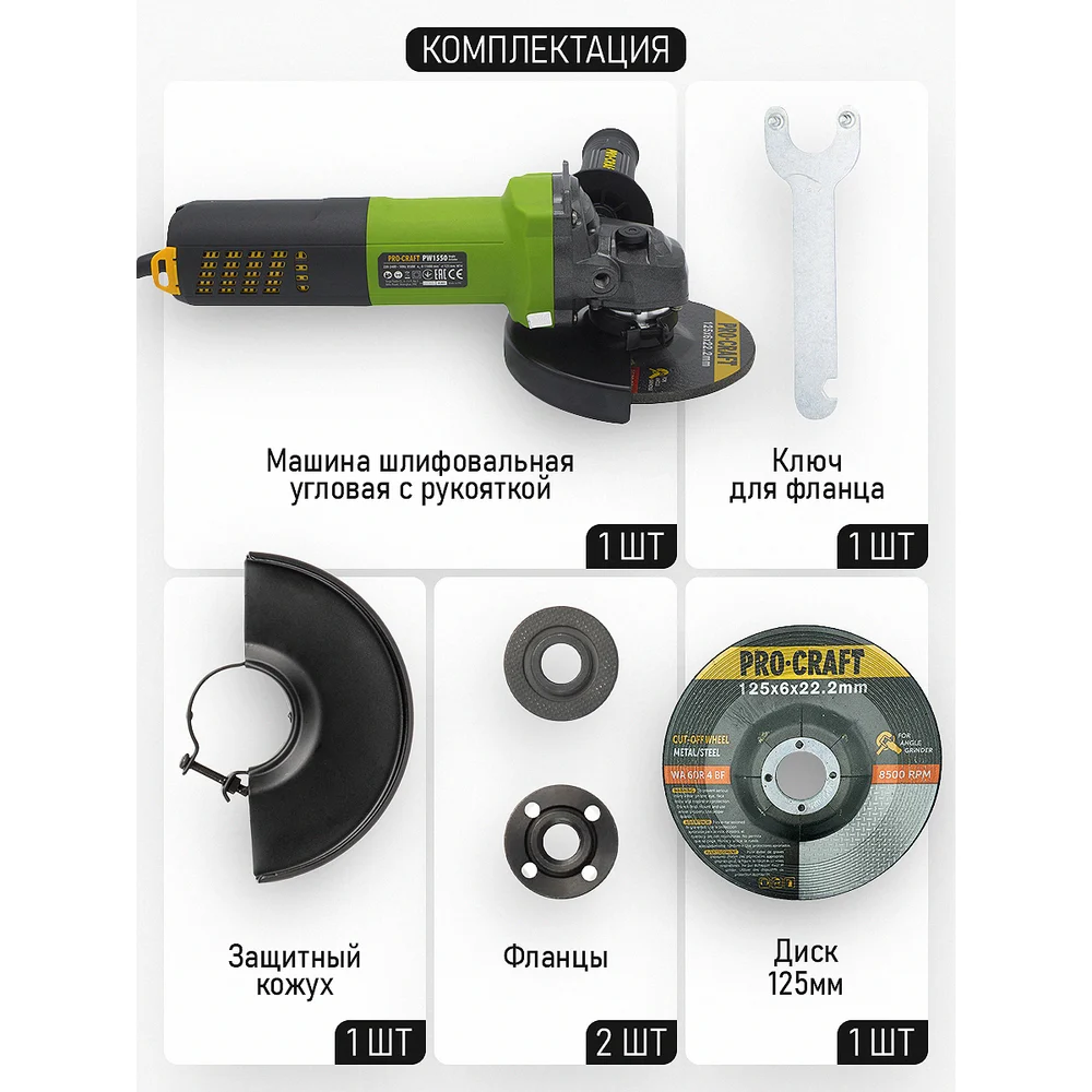 Купить Углошлифовальная машина бесщеточная PROCRAFT 850Вт, 125мм, 0-11000 об/мин PW1550 по лучшей цене с доставкой - интернет магазин №1 в России