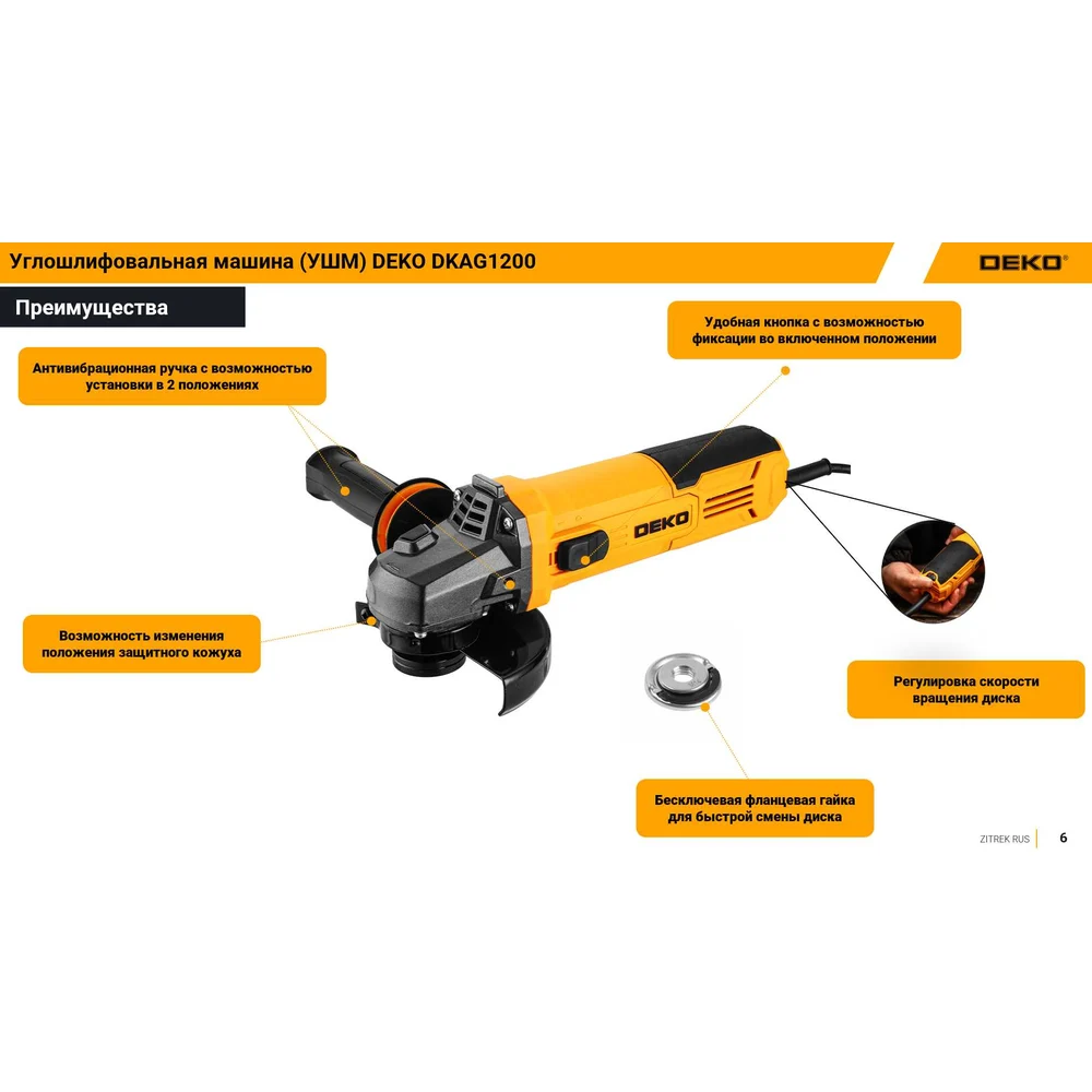 Купить Углошлифовальная машина DEKO DKAG1200, 125мм, 1200 Вт, с антивибрационной рукояткой 085-1008 по лучшей цене с доставкой - интернет магазин №1 в России