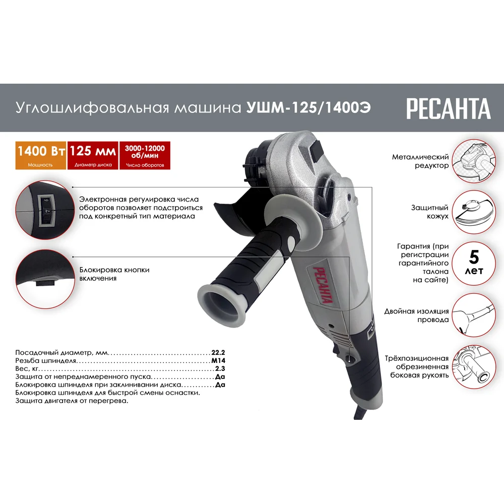 Купить Углошлифовальная машина Ресанта УШМ-125/1400Э 75/12/5 по лучшей цене с доставкой - интернет магазин №1 в России