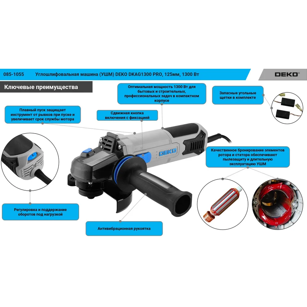 Купить Углошлифовальная машина (УШМ) DEKO DKAG1300 PRO, 125мм, 1300 Вт 085-1055 по лучшей цене с доставкой - интернет магазин №1 в России