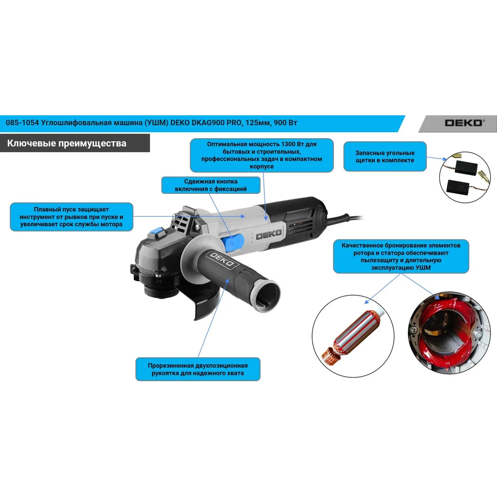 Купить Углошлифовальная машина (УШМ) DEKO DKAG900 PRO, 125мм, 900 Вт 085-1054 по лучшей цене с доставкой - интернет магазин №1 в России