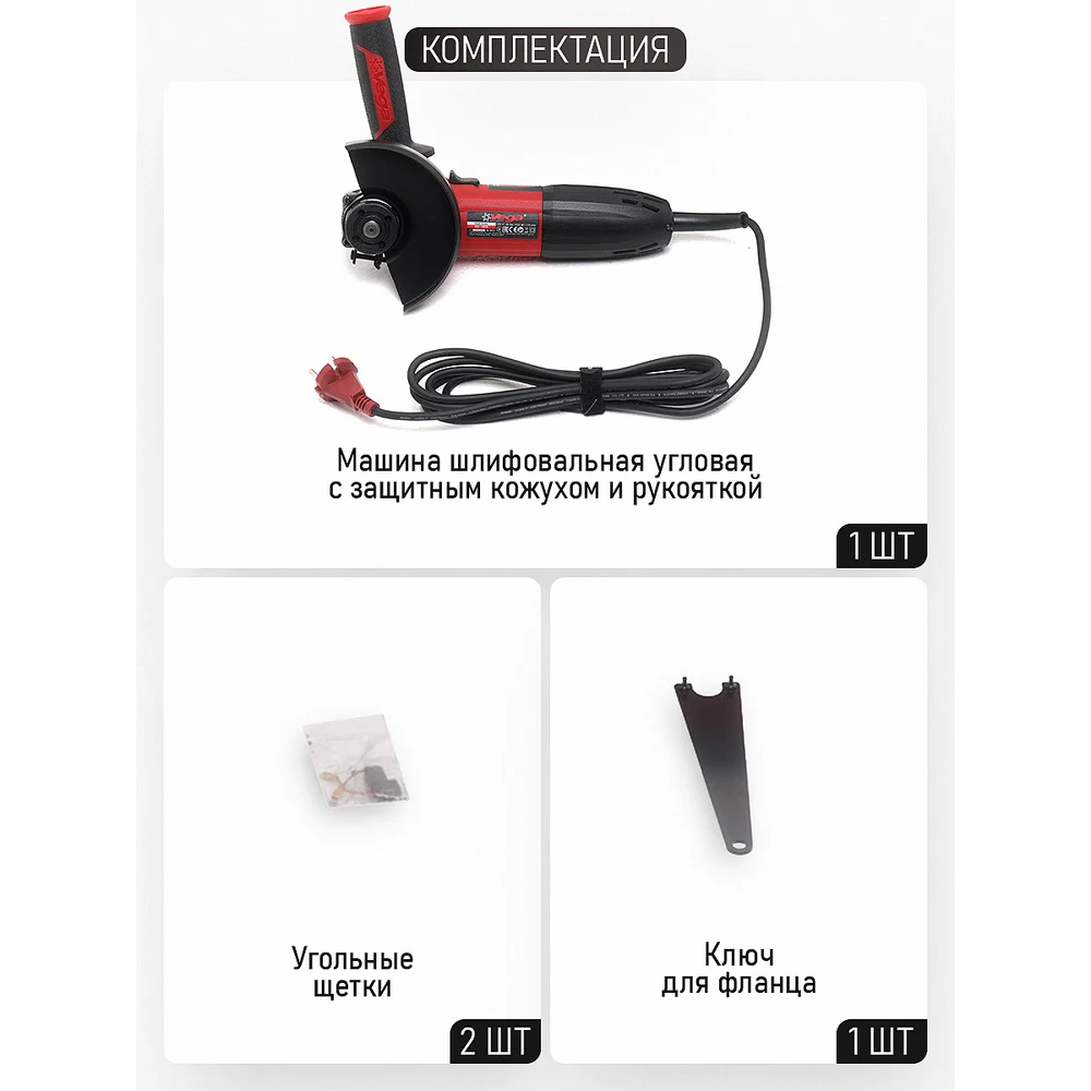 Комплектация Пластиковая рукоятка; Ключ для смены дисков; Щетки электродвигателя; Кожух защиты диска; Руководство по эксплуатации