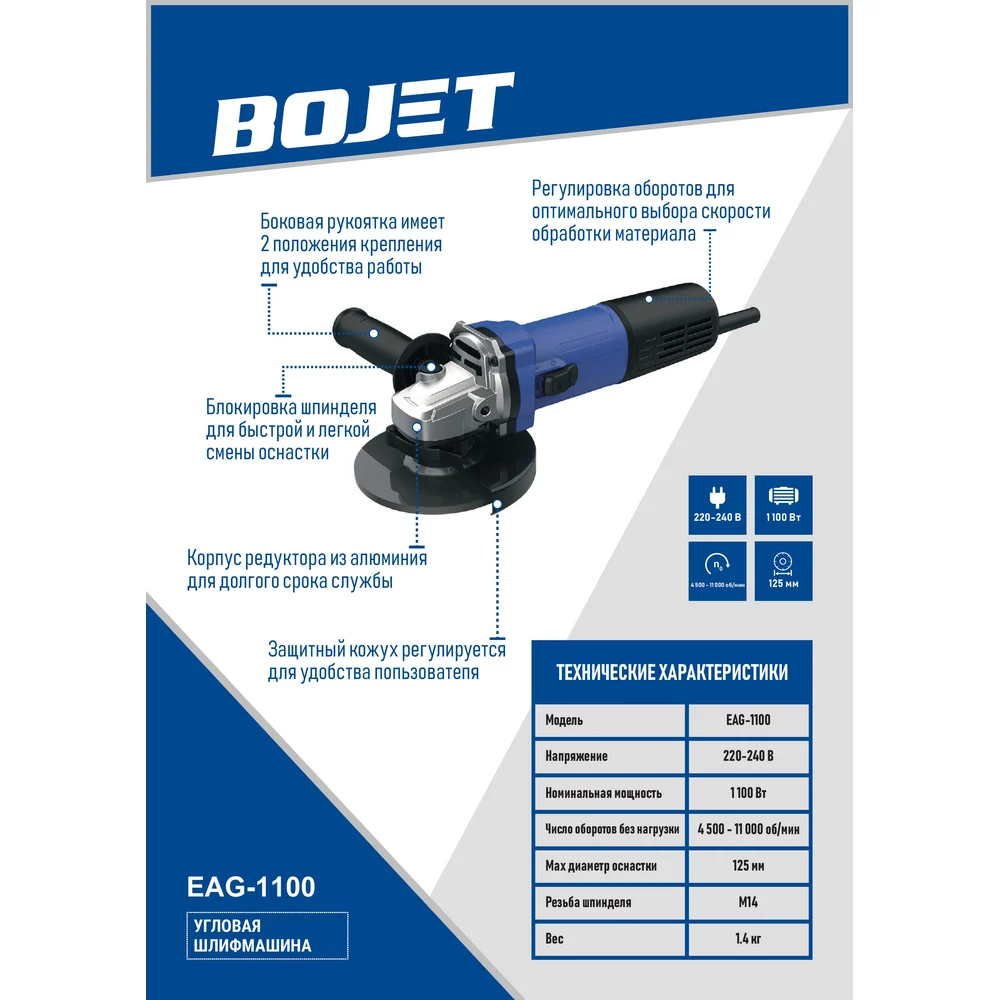 Угловая шлифмашина BOJET 125 мм, 1100Вт, 4500-11000 об/мин, EAG-1100