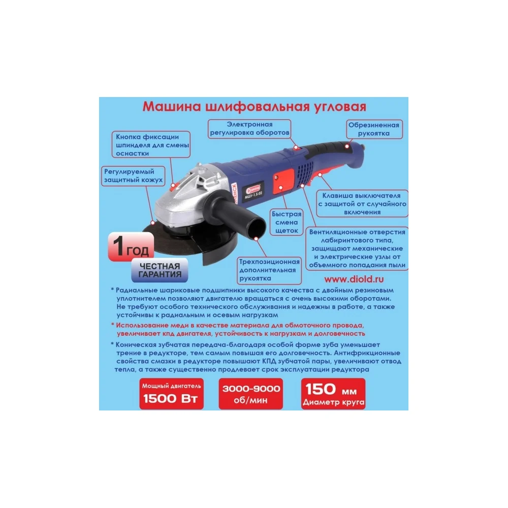 Купить Угловая шлифовальная машина ДИОЛД МШУ-1.5-02 10041201 по лучшей цене с доставкой - интернет магазин №1 в России