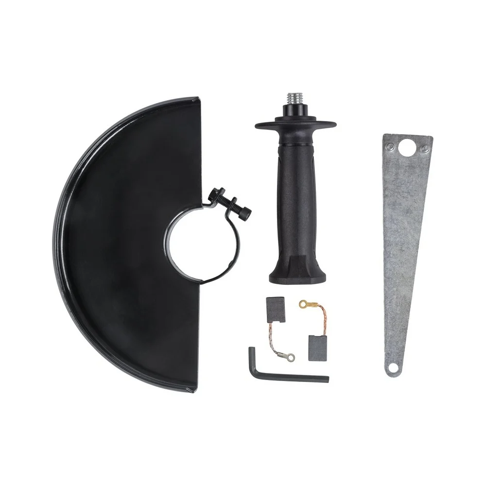 Комплектация УШМ; Защитный кожух; Ключ; Дополнительная рукоятка; Гайка и фланец - 1 компл; Инструкция по эксплуатации и гарантийный талон; Цветная коробка
