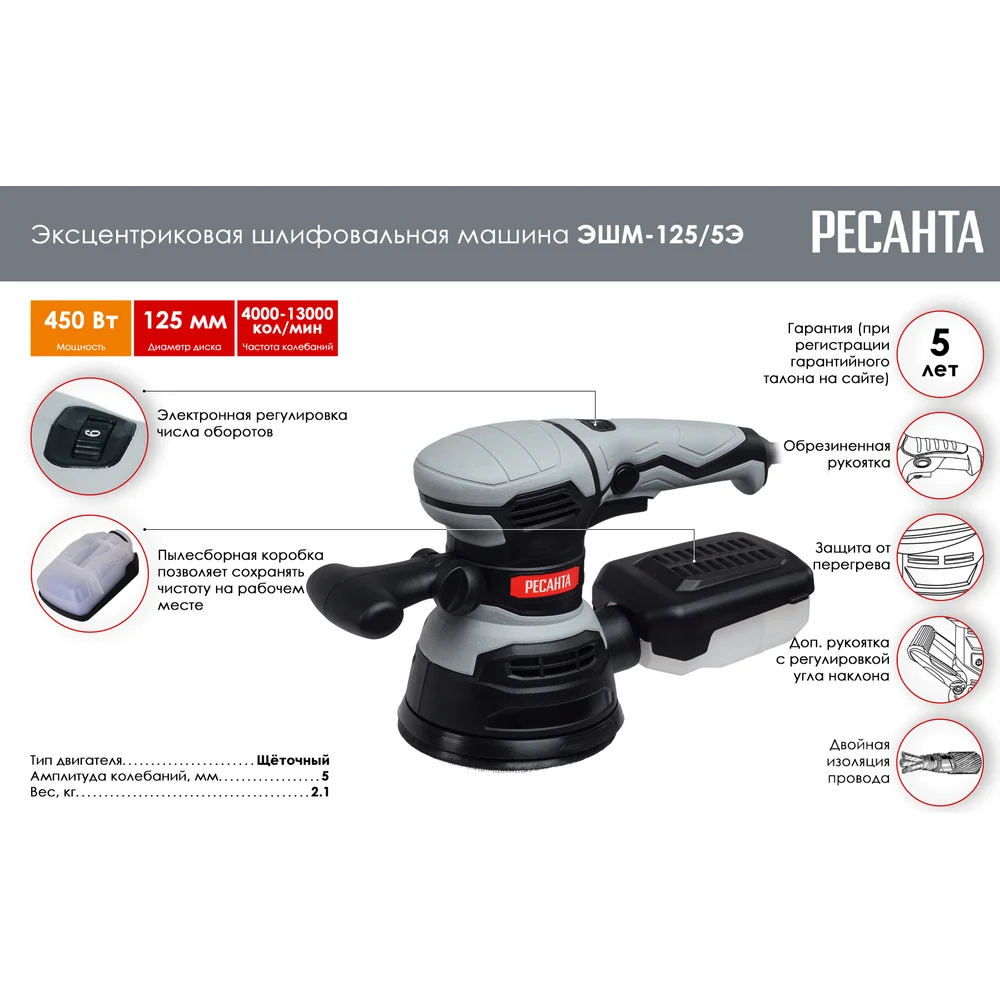 Купить Эксцентриковая шлифовальная машина Ресанта ЭШМ-125/5Э 75/6/3 по лучшей цене с доставкой - интернет магазин №1 в России