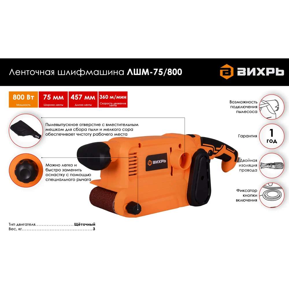 Купить Ленточная шлифмашина ВИХРЬ ЛШМ-75/800 72/6/1 по лучшей цене с доставкой - интернет магазин №1 в России