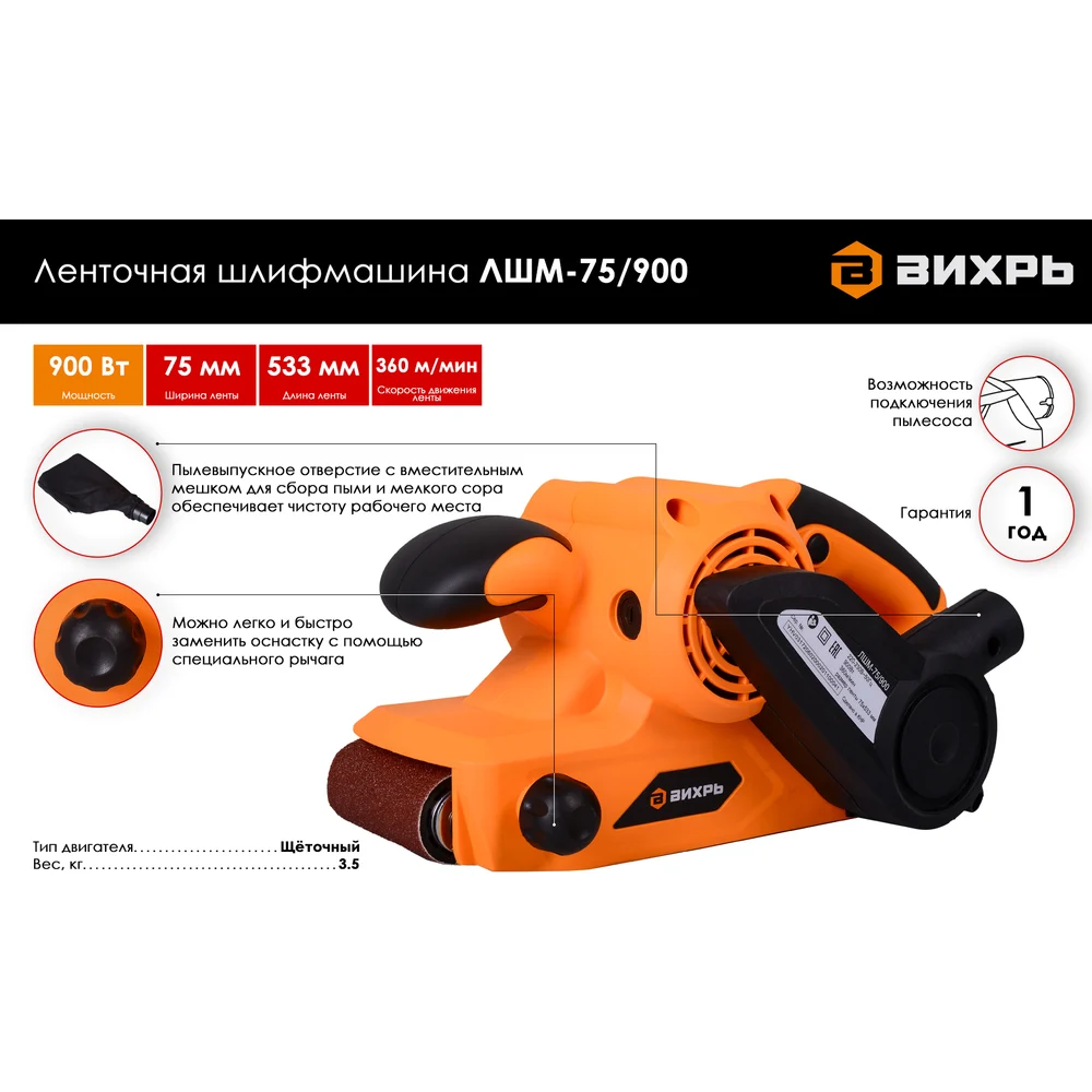 Купить Ленточная шлифмашина ВИХРЬ ЛШМ-75/900 72/6/2 по лучшей цене с доставкой - интернет магазин №1 в России