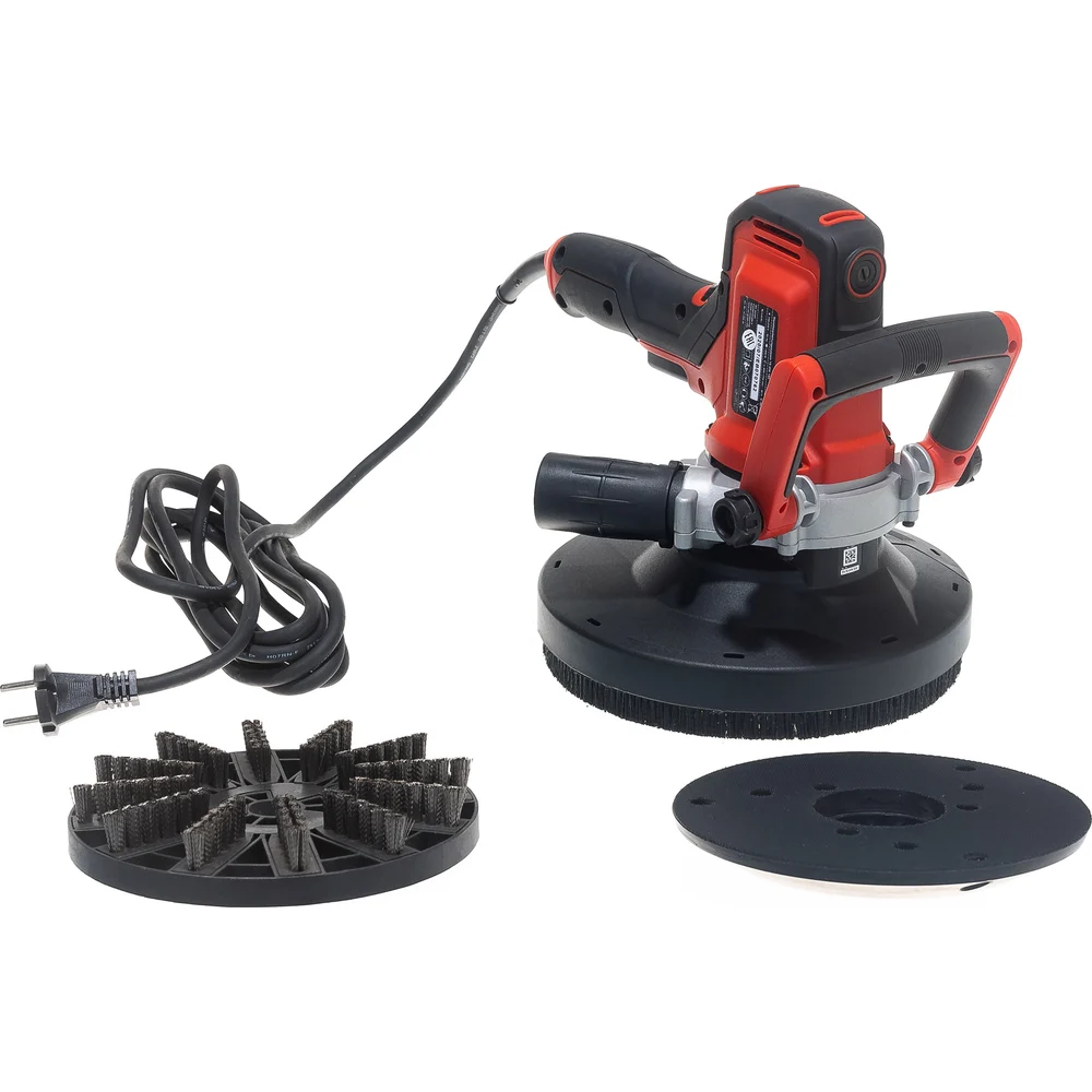 Комплектация Шлифмашина; Основание для шлифовальных дисков с креплением «липучка»; Алмазная шлифовальная чашка для шлифовки бетона, штукатурки и камня; Стальная чистящая щетка для зачистки стен от обоев и шлифовки бетона; 6 шлифовальных дисков (2*P60/2*P80/2*P120); Коробка
