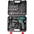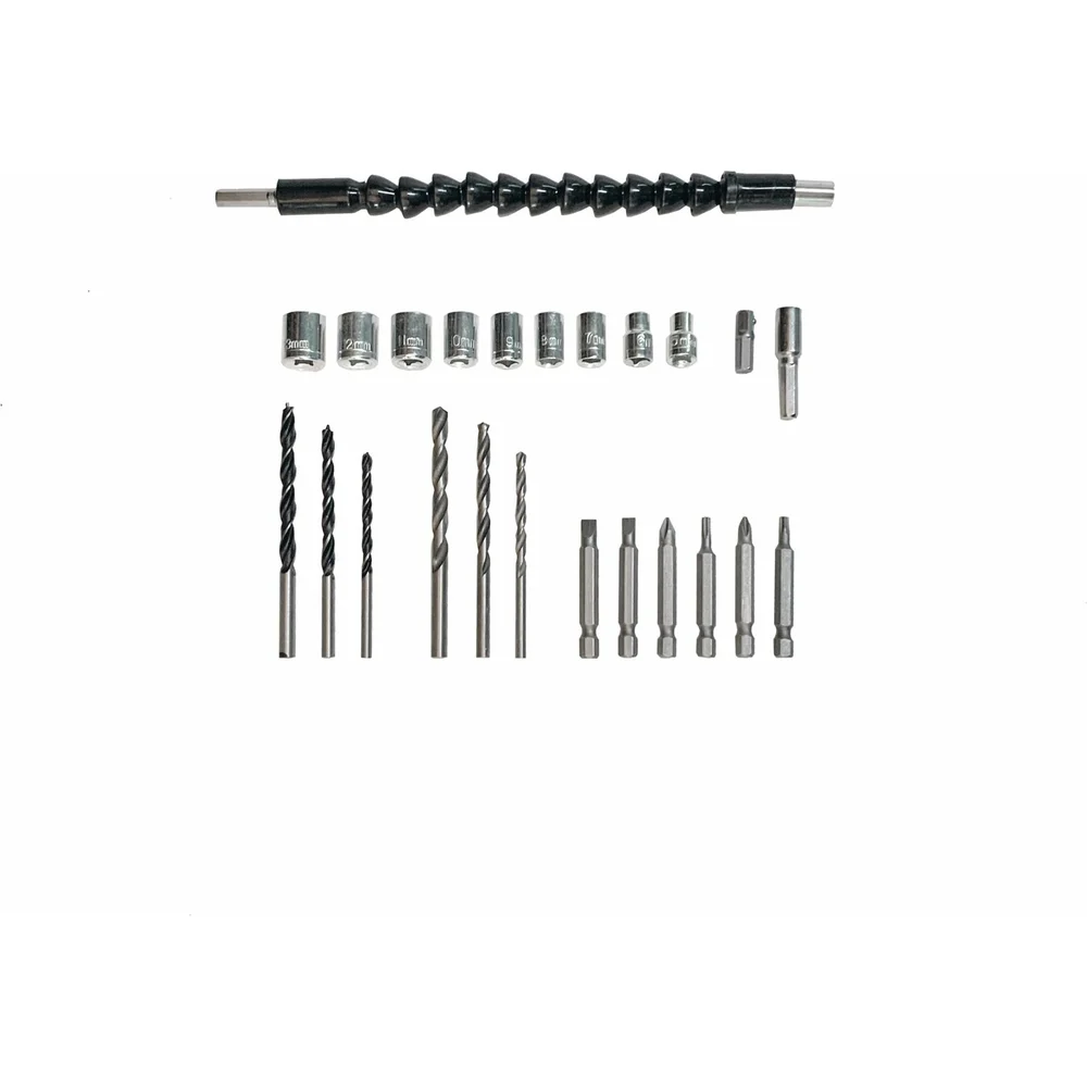 Комплектация Аккумуляторная дрель-шуруповерт; 2 Li-ion аккумулятора; Зарядное устройство; 6 бит + удлинитель для них; Сверла по дереву - 3шт; Сверла по металлу - 3 шт; Торцовые головки - 9 шт; Гибкий удлинитель; Переходник для торцевых головок; Кейс