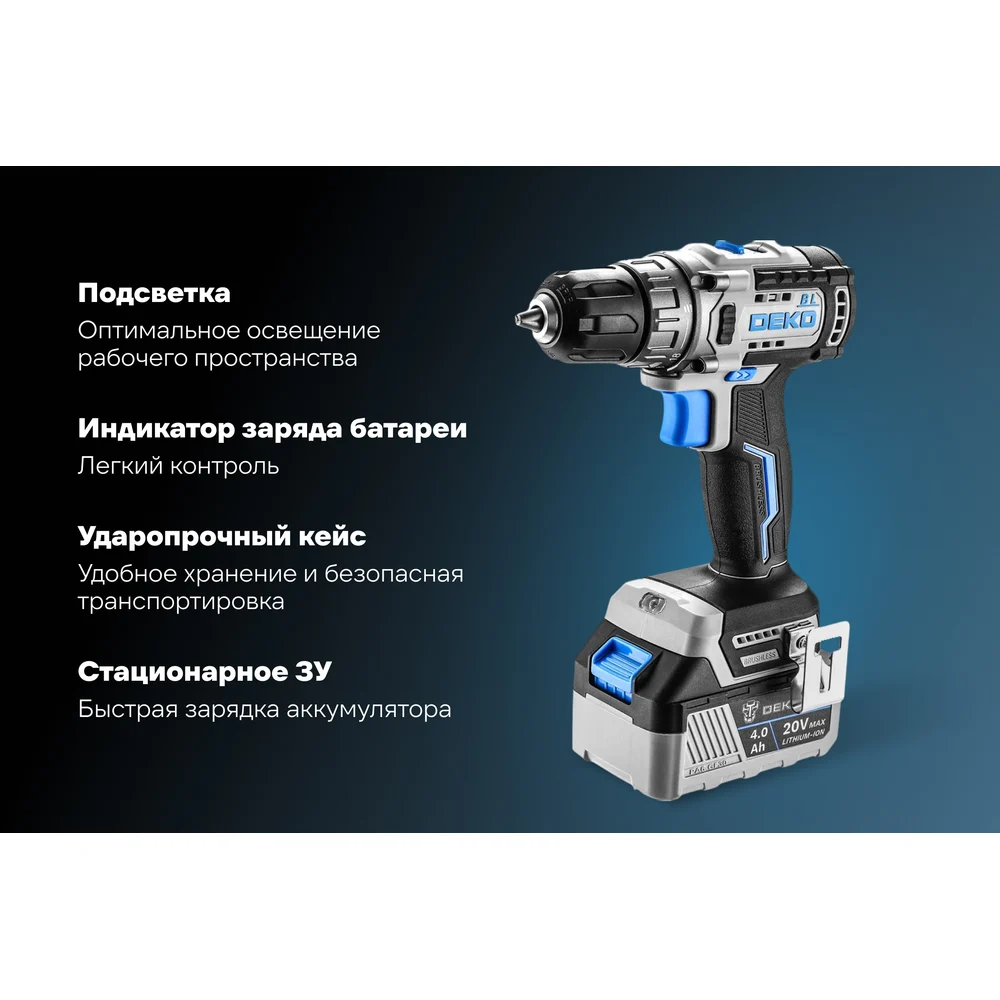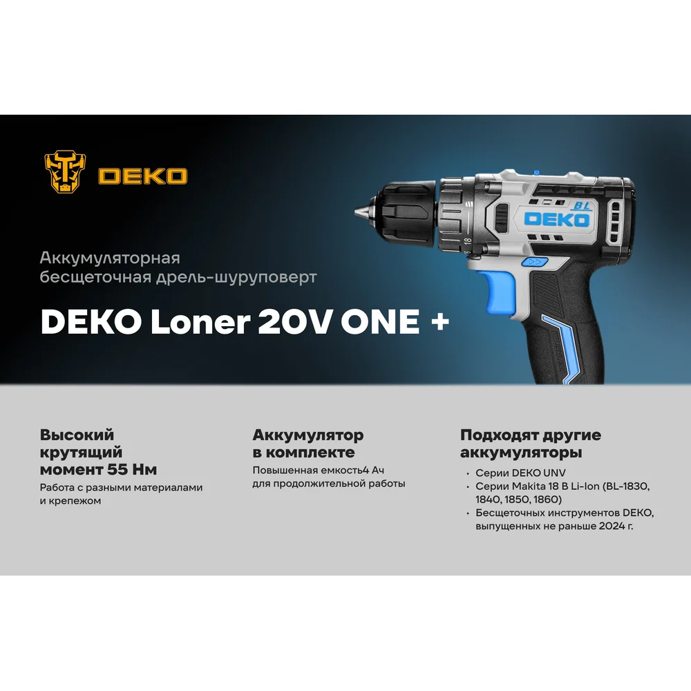 Купить Аккумуляторная бесщеточная дрель-шуруповерт DEKO Loner 20V ONE +, 20В, 1x4.0 Ач 085-1004 по лучшей цене с доставкой - интернет магазин №1 в России